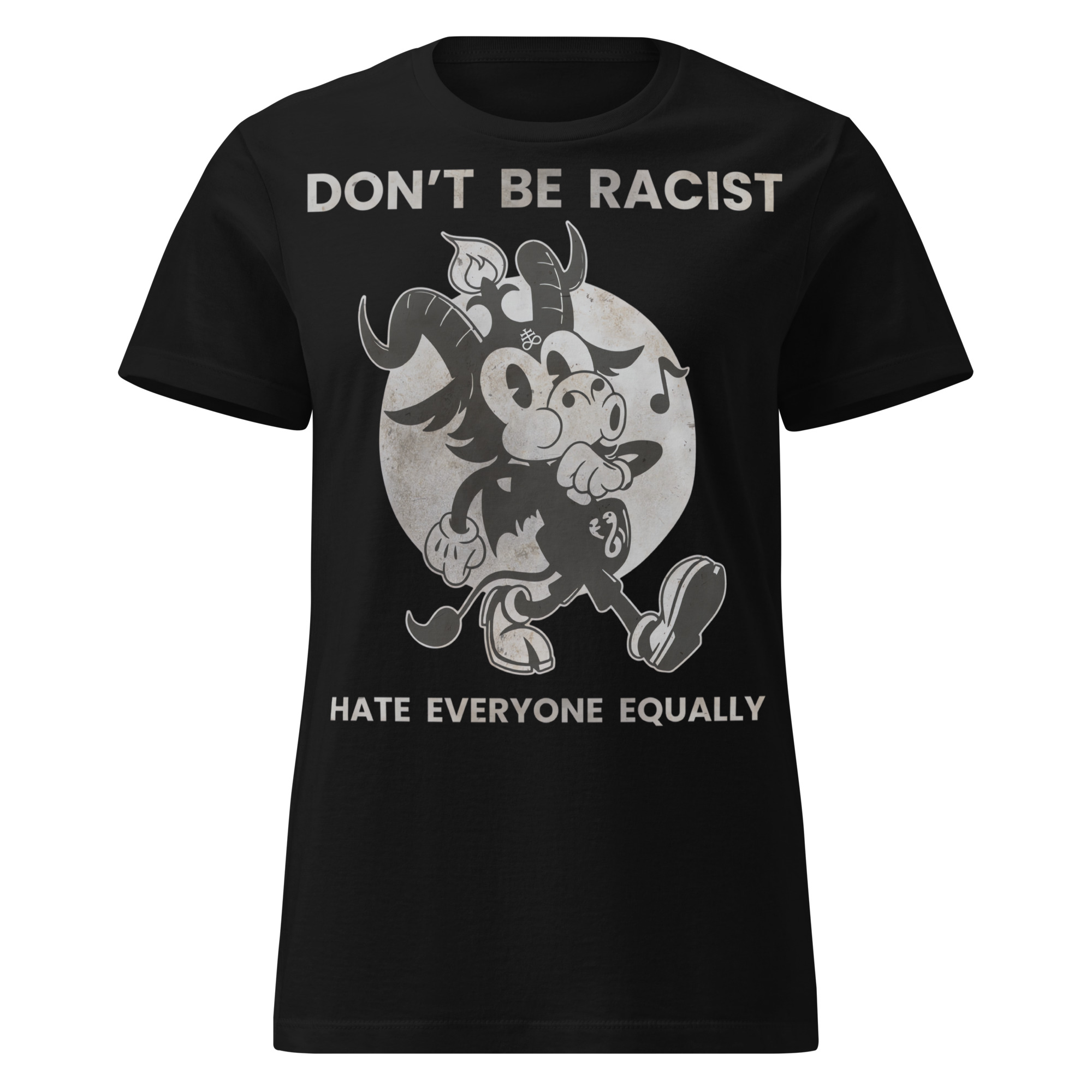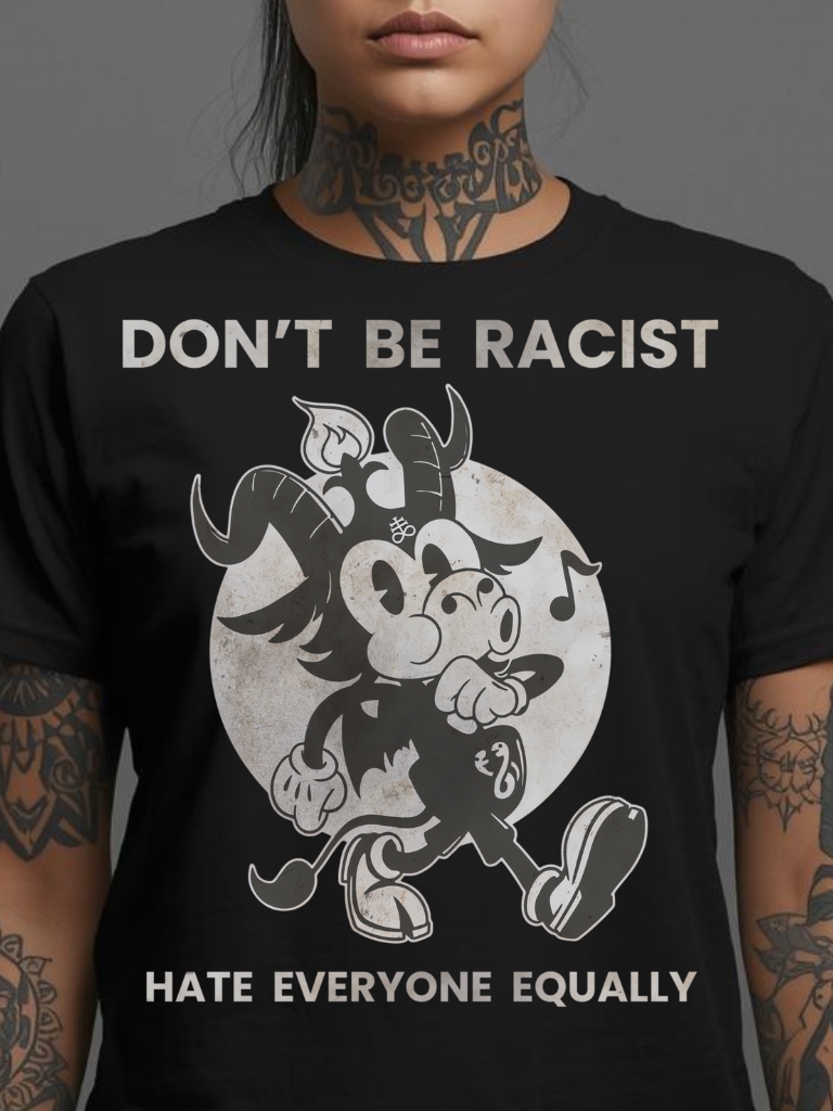 Semi-fitted t-shirt i svart med en tecknad Baphomet och texten ’Don’t be racist, hate everyone equally’ som dekoration på framsidan. Passar perfekt till kvinnor som älskar den alternativa stilen. Tröjan är tillverkad i en fin kvalitet i 100% bomull.