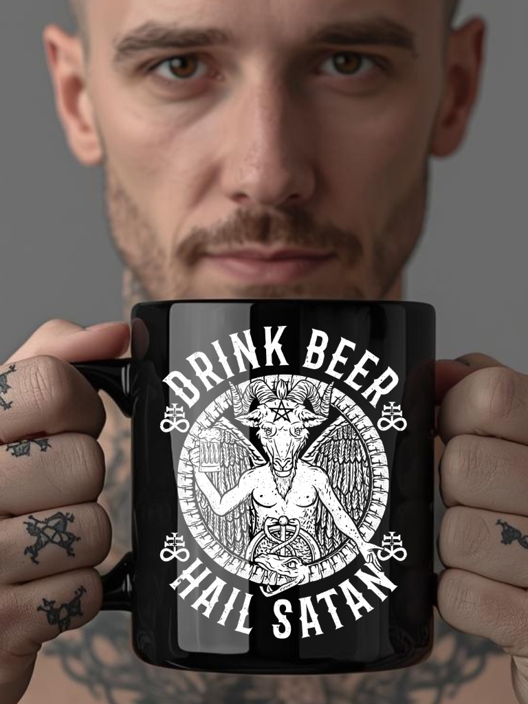 Mugg i svart med Baphomet som dricker öl och texten ’Drink beer, hail Satan’ som motiv på båda sidorna. Muggen är tillverkad i keramik och tål både maskindisk och uppvärmning i mikrovågsugn.