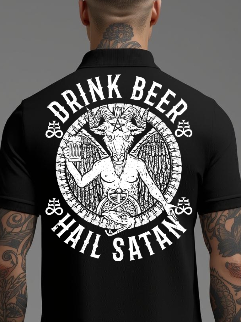 Snygg och stilren pikétröja i premium-kvalitet med Baphomet som dricker öl och texten ’Drink beer, hail Satan’ på ryggen. Tröjan är tillverkad i 100% ringspunnen bomull i en extra fin kvalitet. Passar perfekt till både män och kvinnor.