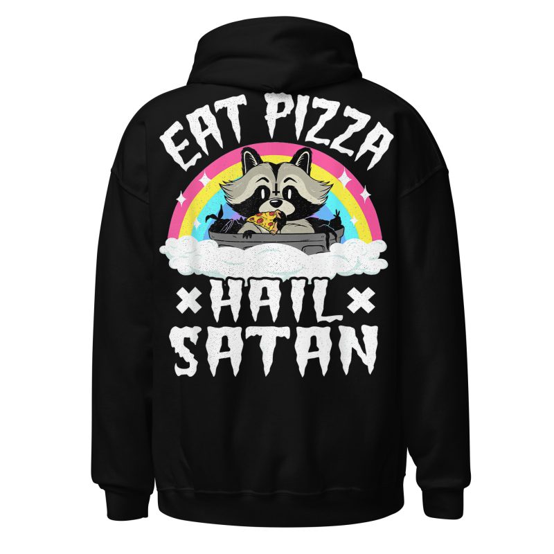 Hoodie i unisex-modell tillverkad i en extra fin kvalitet i blandad bomull och polyester. På baksidan återfinns en tvättbjörn som äter pizza och texten ’Eat pizza, hail Satan’ som dekoration. Hoodien håller värmen riktigt bra och har ett otroligt mjukt tyg.