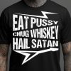 T-shirt i svart med texten ’Eat pussy, chug whiskey, hail Satan’ som dekoration på framsidan. Passar perfekt till både män och kvinnor som älskar Satan, whisky och pussy. Tröjan är tillverkad i en fin kvalitet i 100% bomull.