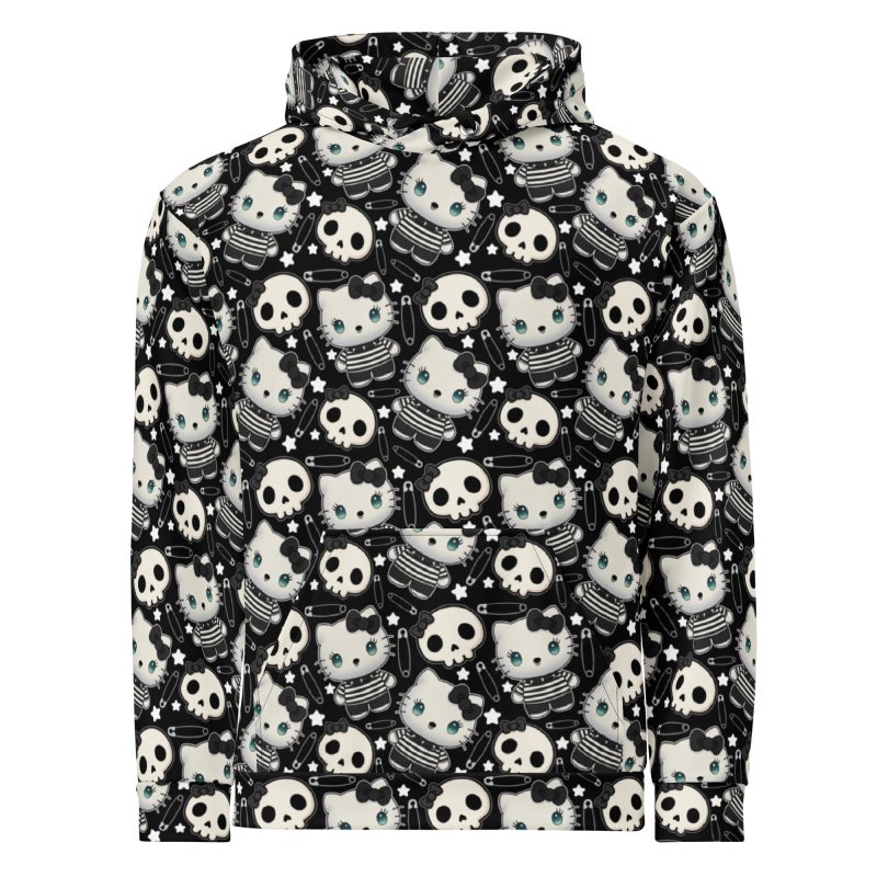 Varm och skön hoodie i premium-kvalitet med söta emo-katter, säkerhetsnålar och döskallar som dekoration. Tillverkad i återvunnen polyester och elastan av hög kvalitet som känns som mjuk bomull. Tröjan är i unisex-modell och finns upp till storlek 6XL för att passa de flesta.
