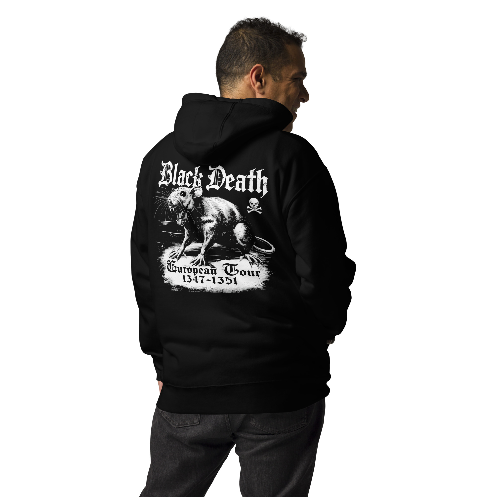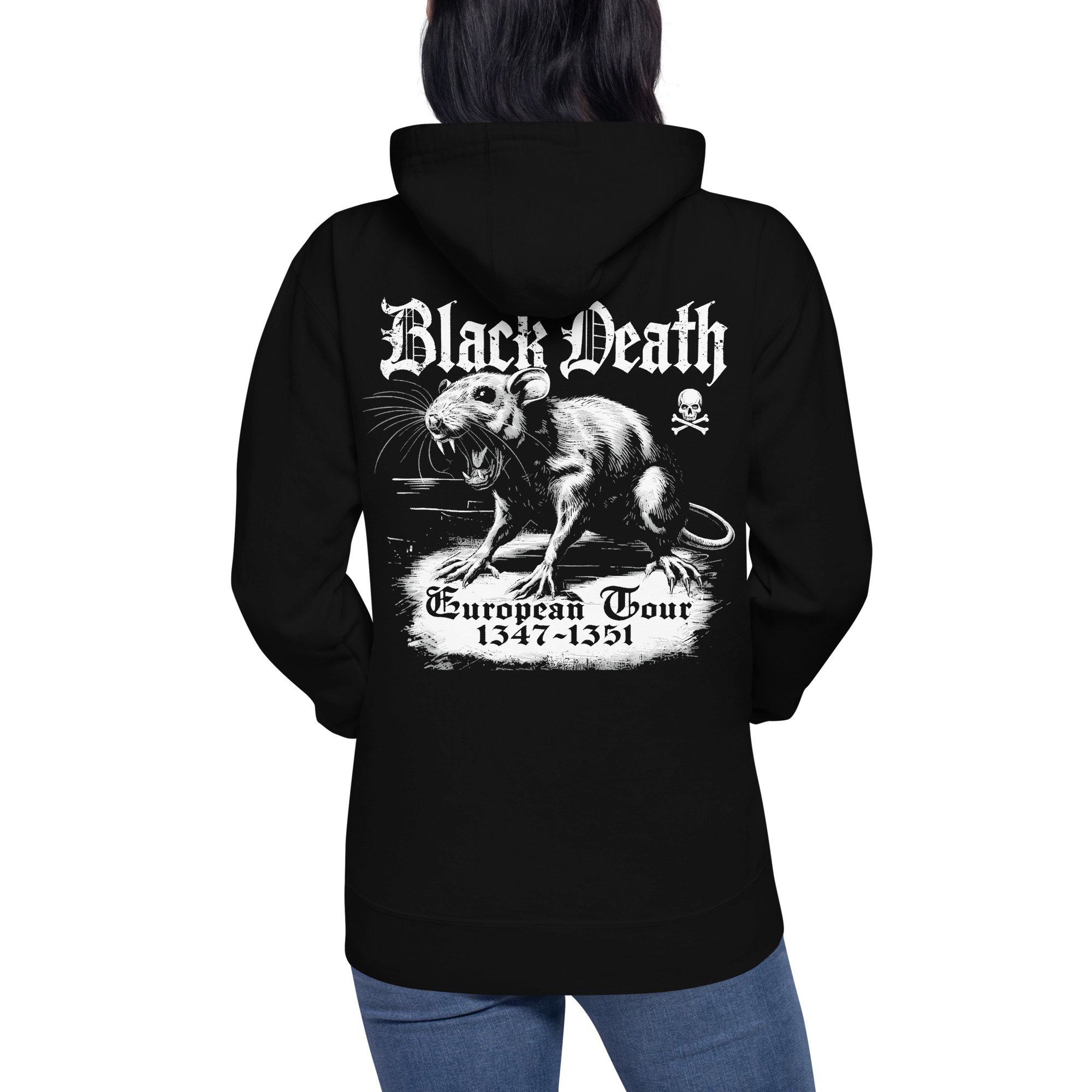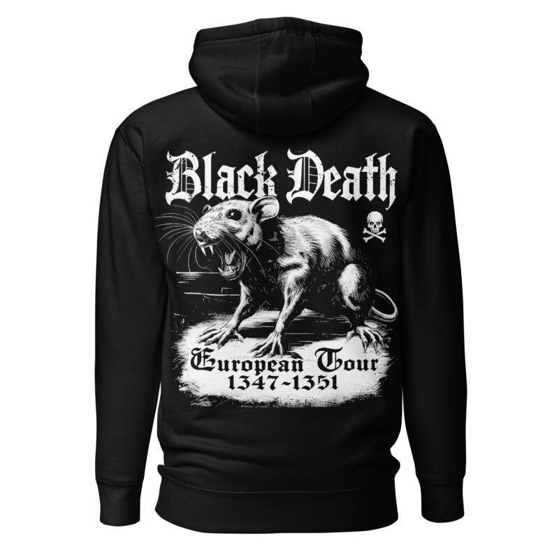Hoodie i unisex-modell tillverkad i en extra fin kvalitet i blandad bomull och polyester. På baksidan återfinns en stor råtta och texten ’Black death european tour’ som dekoration. Hoodien håller värmen riktigt bra och har ett otroligt mjukt tyg. Passar alla oss som älskar den alternativa stilen.