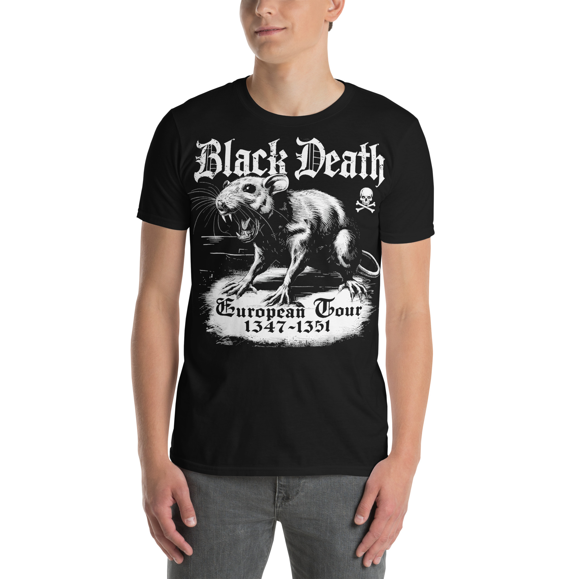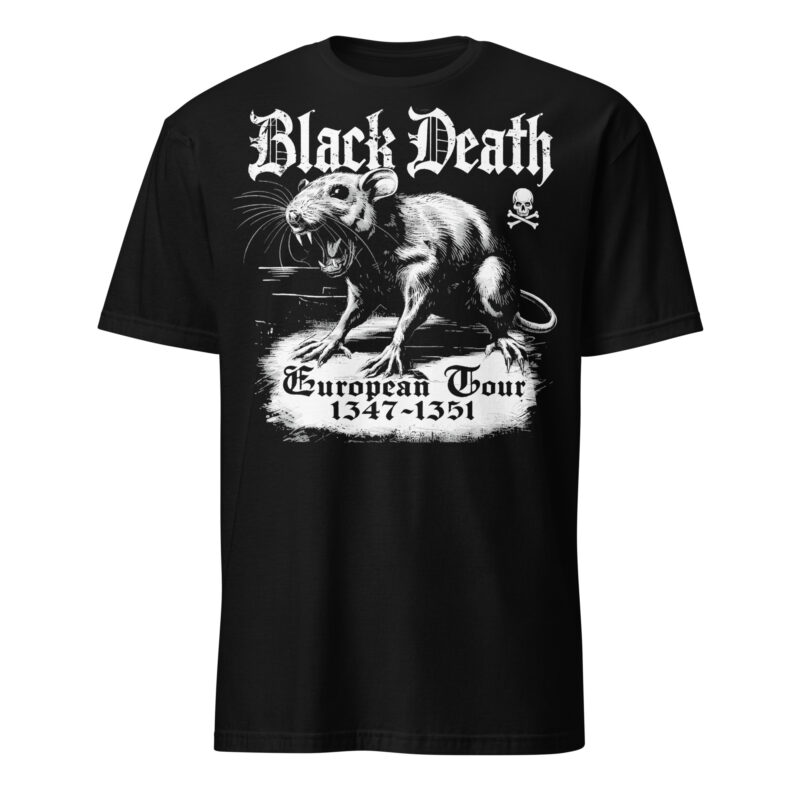 T-shirt i svart med en stor råtta och texten ’Black death european tour’ som dekoration på framsidan. Passar perfekt till både män och kvinnor som älskar den alternativa stilen. Tröjan är tillverkad i en supermjuk kvalitet i 100% bomull.