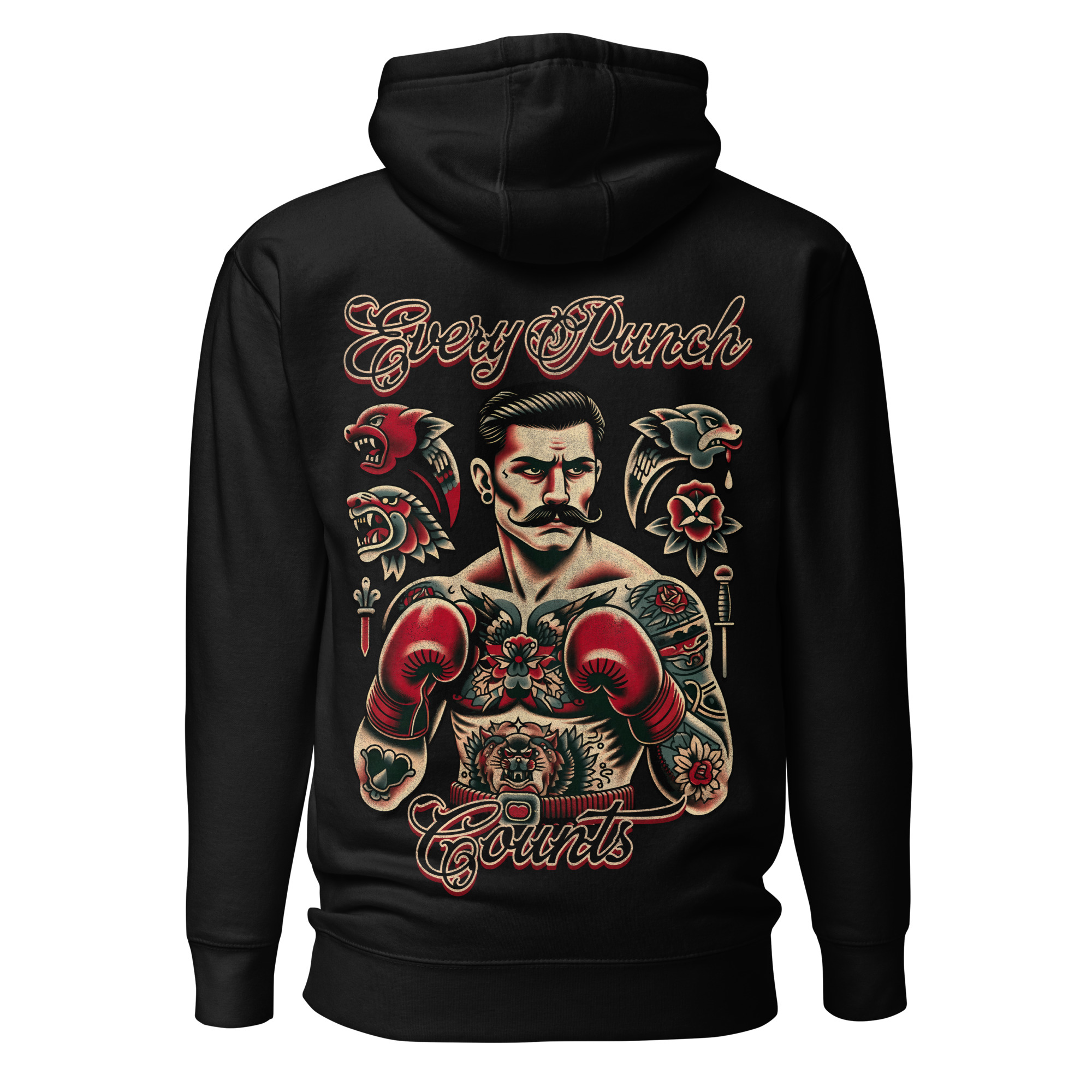 Hoodie tillverkad i en extra fin kvalitet i blandad bomull och polyester. På ryggen finns en tatuerad boxare och texten ’Every punch counts’ som dekoration. Hoodien håller värmen riktigt bra och har ett otroligt mjukt tyg. Passar både män och kvinnor.