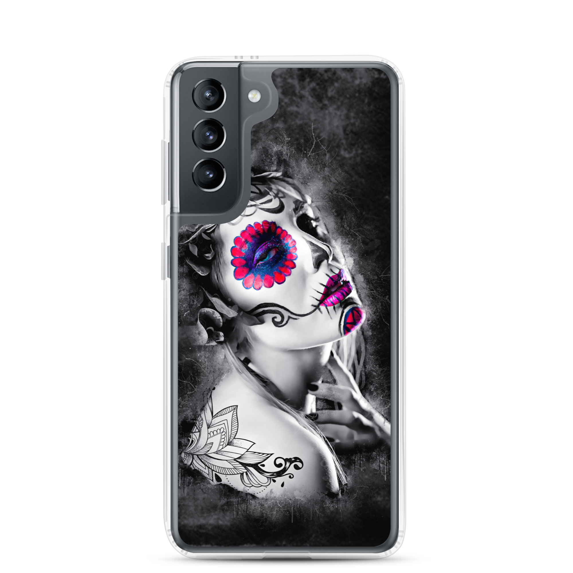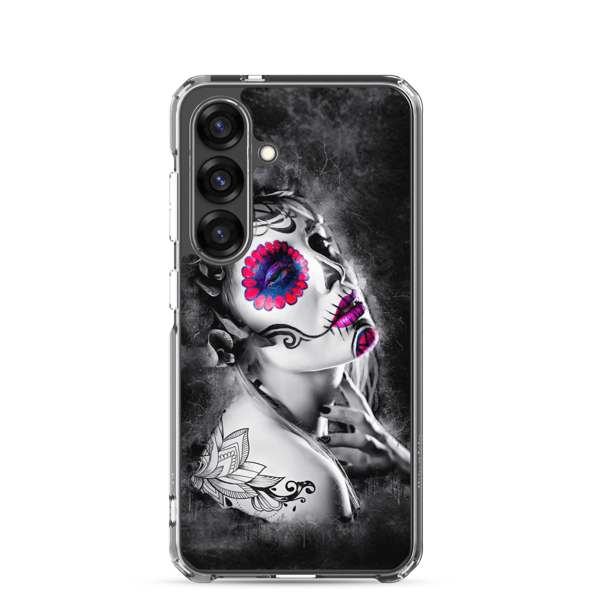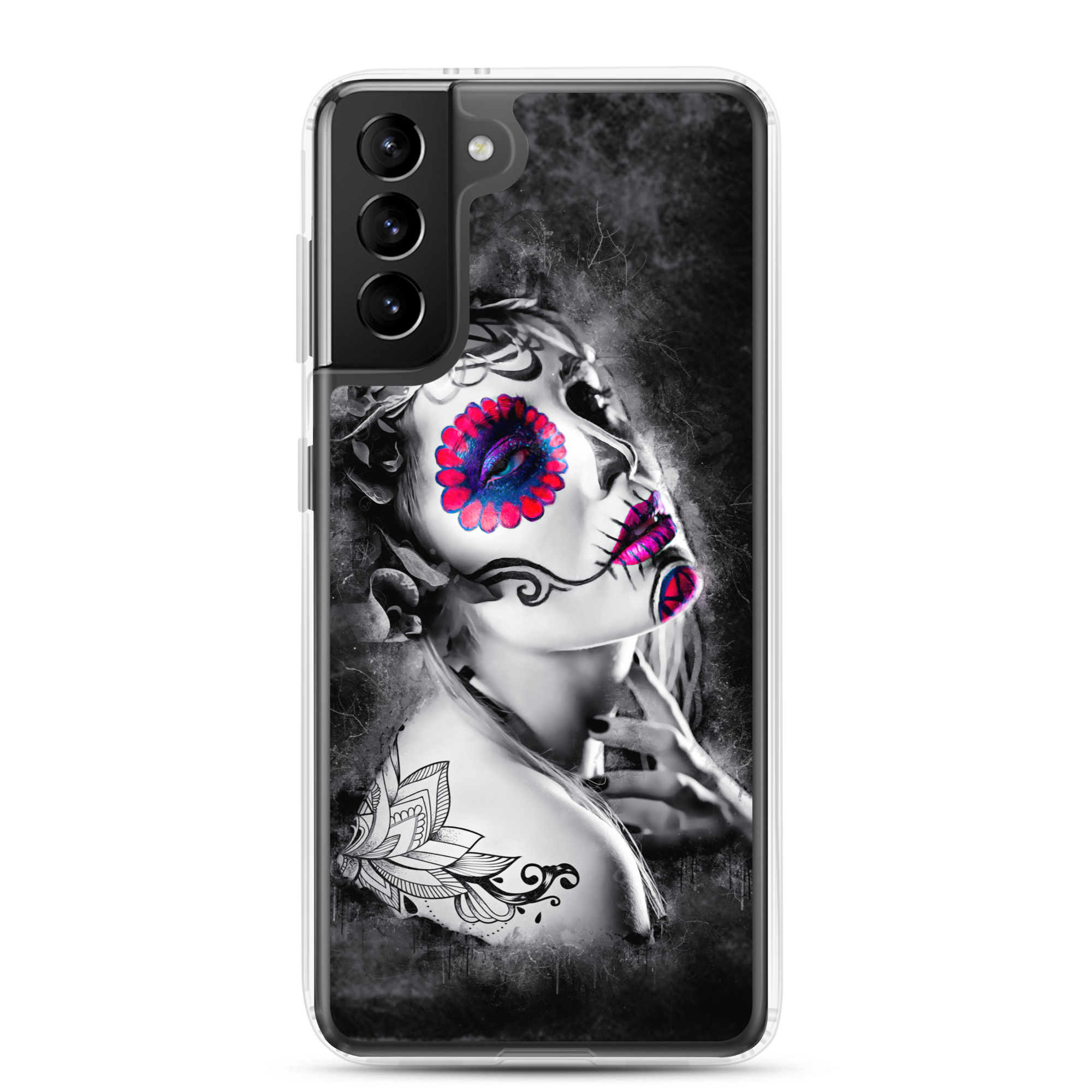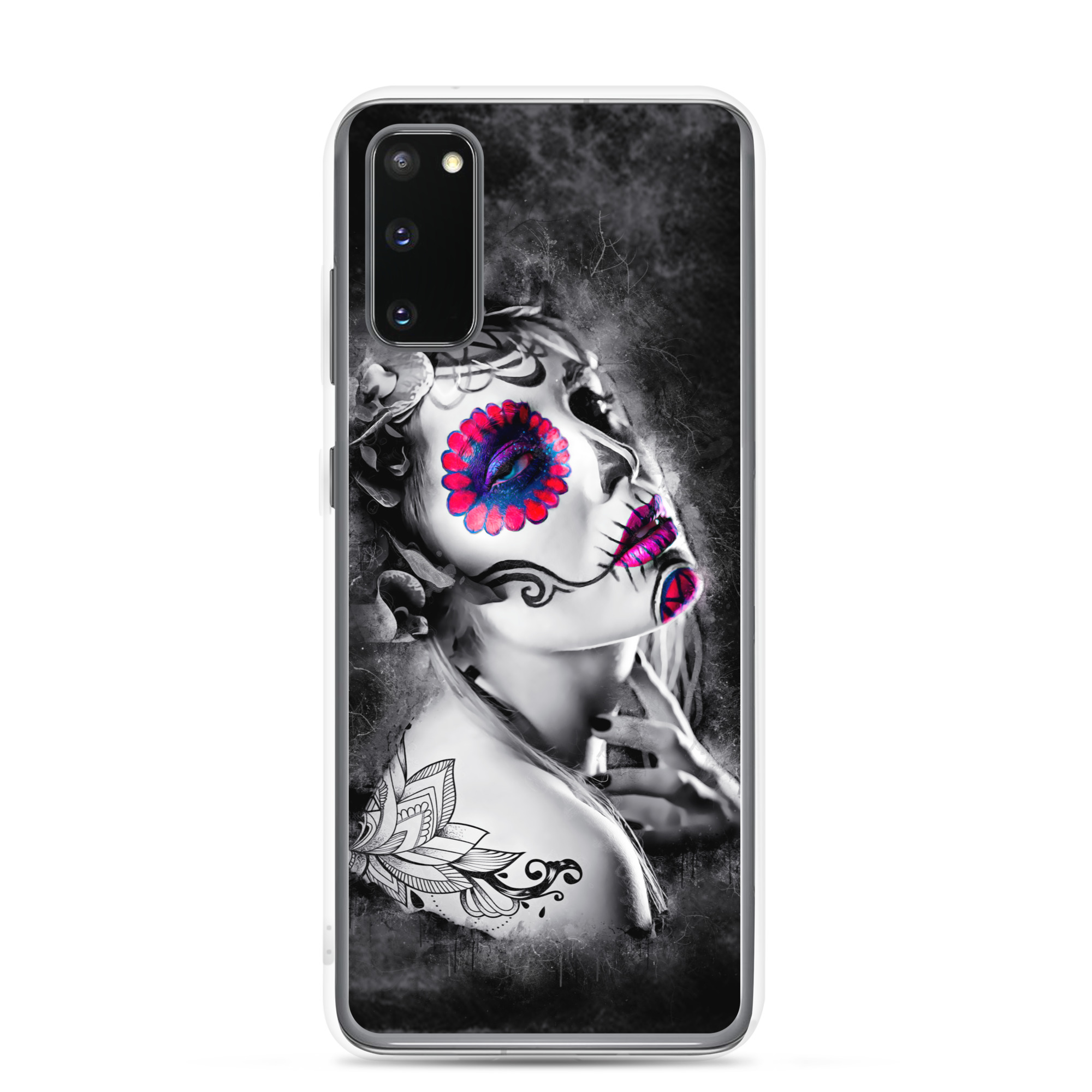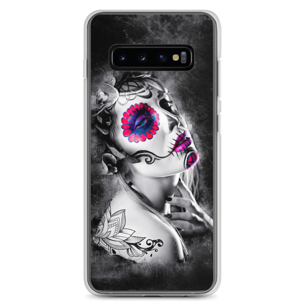 Mobilskal som passar Samsung Galaxy-modellerna med ett konstnärligt motiv på en ansiktsmålad kvinna som dekoration. Tillverkad i hög kvalitet och skyddar baksidan och sidorna på din telefon mot repor, smuts, olja och damm. Sidorna är genomskinliga och har färdiga hål för laddning, volym, hörlurar och på/avstängning. Skalet är väldigt slitstarkt och enkelt att ta av telefonen på grund av det följsamma materialet runtom. Kompatibla för trådlös laddning.