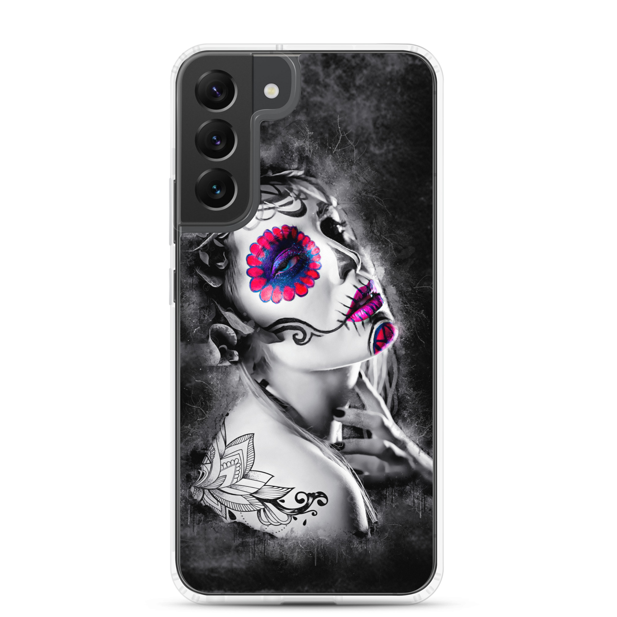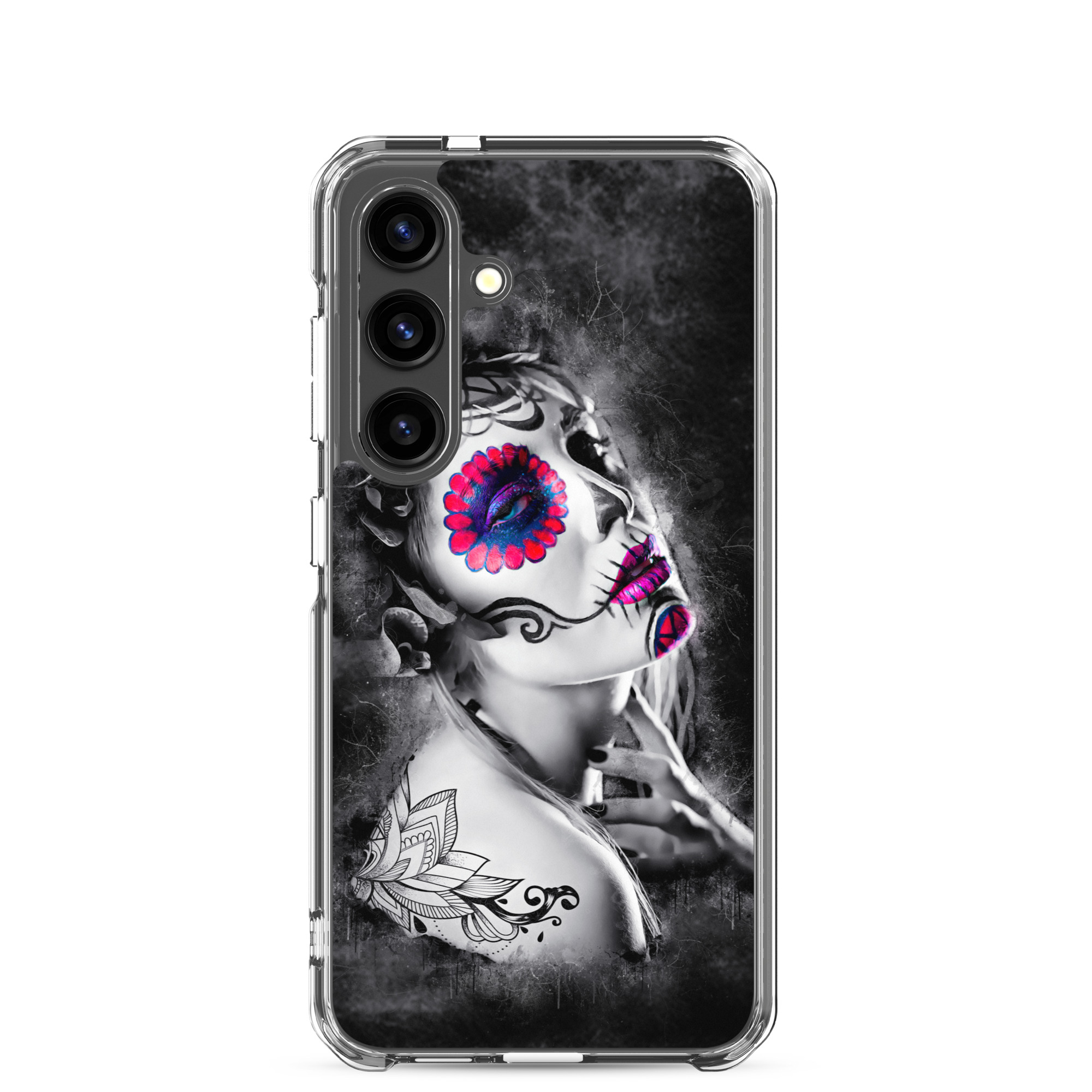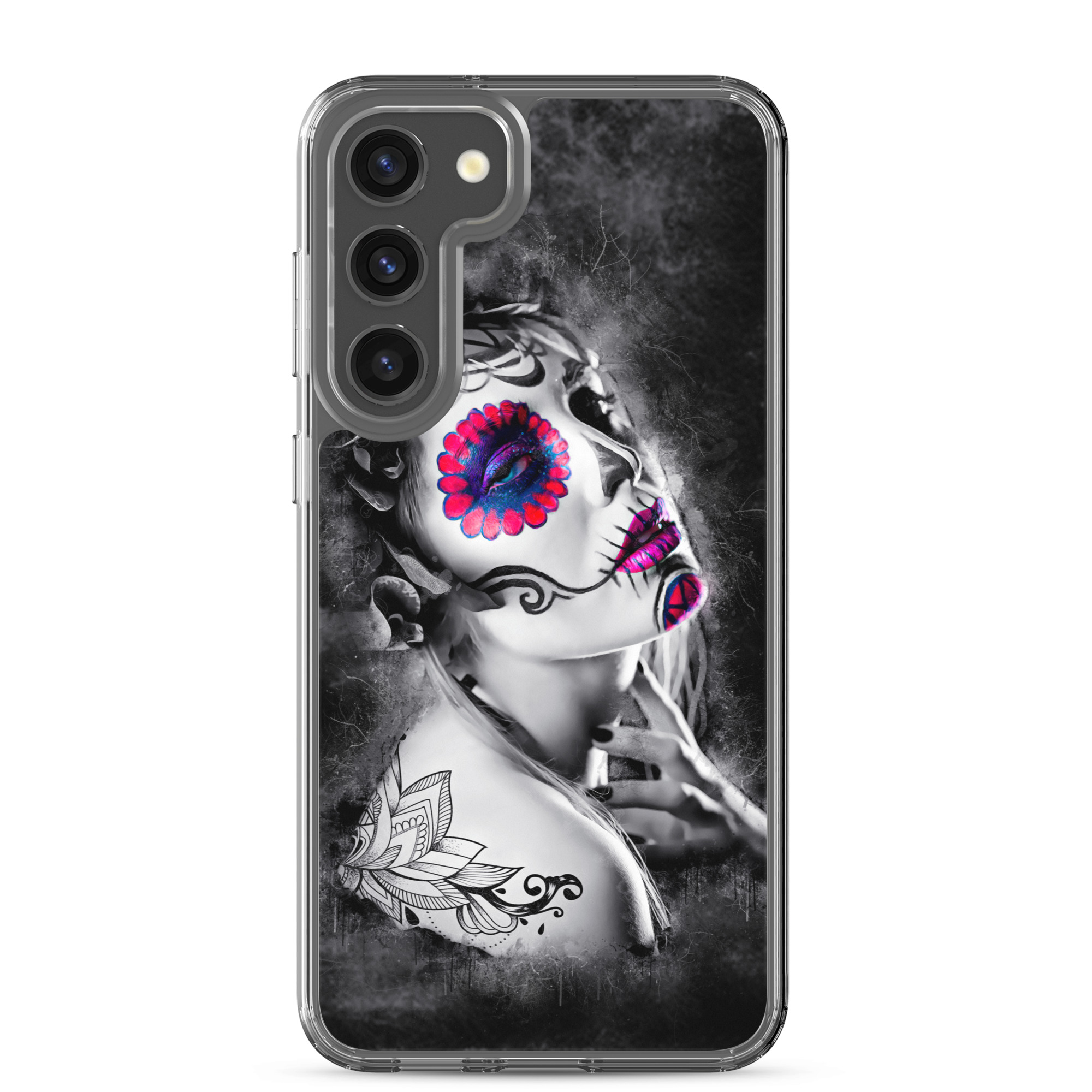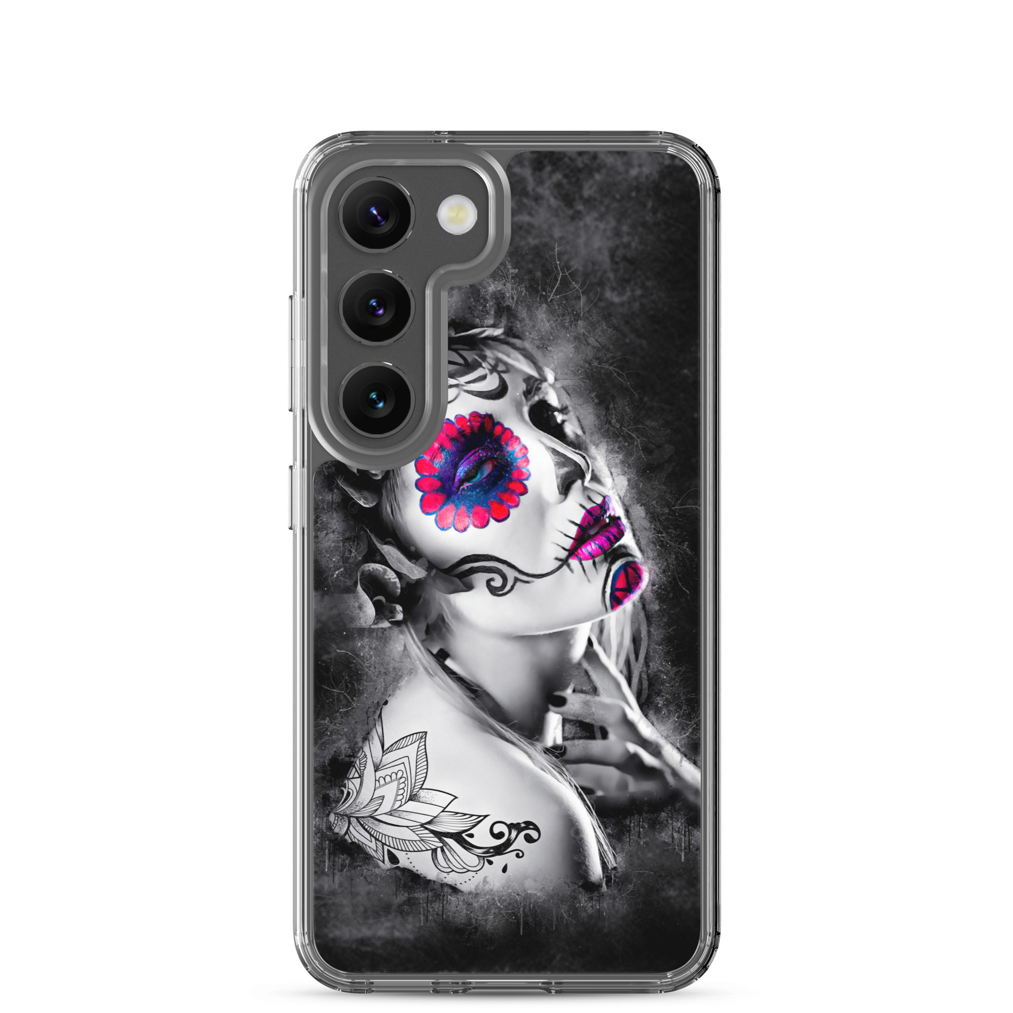Mobilskal som passar Samsung Galaxy-modellerna med ett konstnärligt motiv på en ansiktsmålad kvinna som dekoration. Tillverkad i hög kvalitet och skyddar baksidan och sidorna på din telefon mot repor, smuts, olja och damm. Sidorna är genomskinliga och har färdiga hål för laddning, volym, hörlurar och på/avstängning. Skalet är väldigt slitstarkt och enkelt att ta av telefonen på grund av det följsamma materialet runtom. Kompatibla för trådlös laddning.