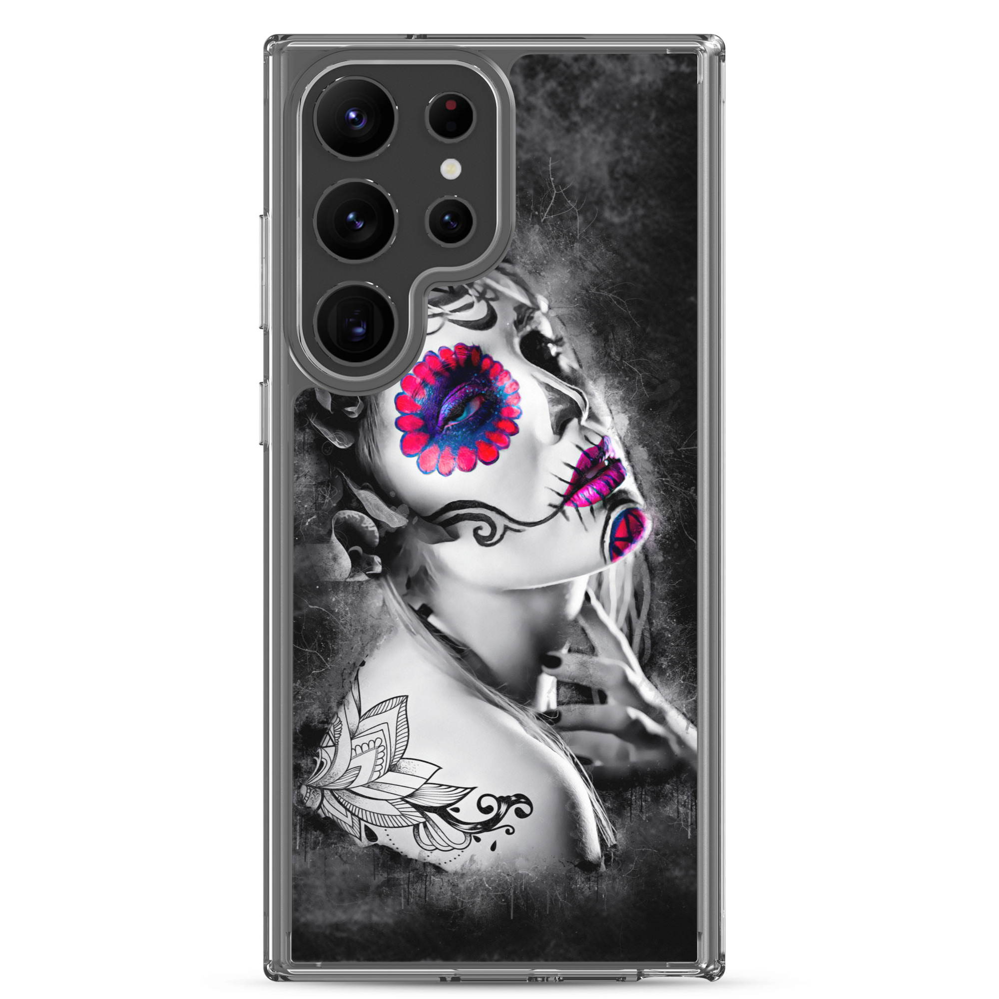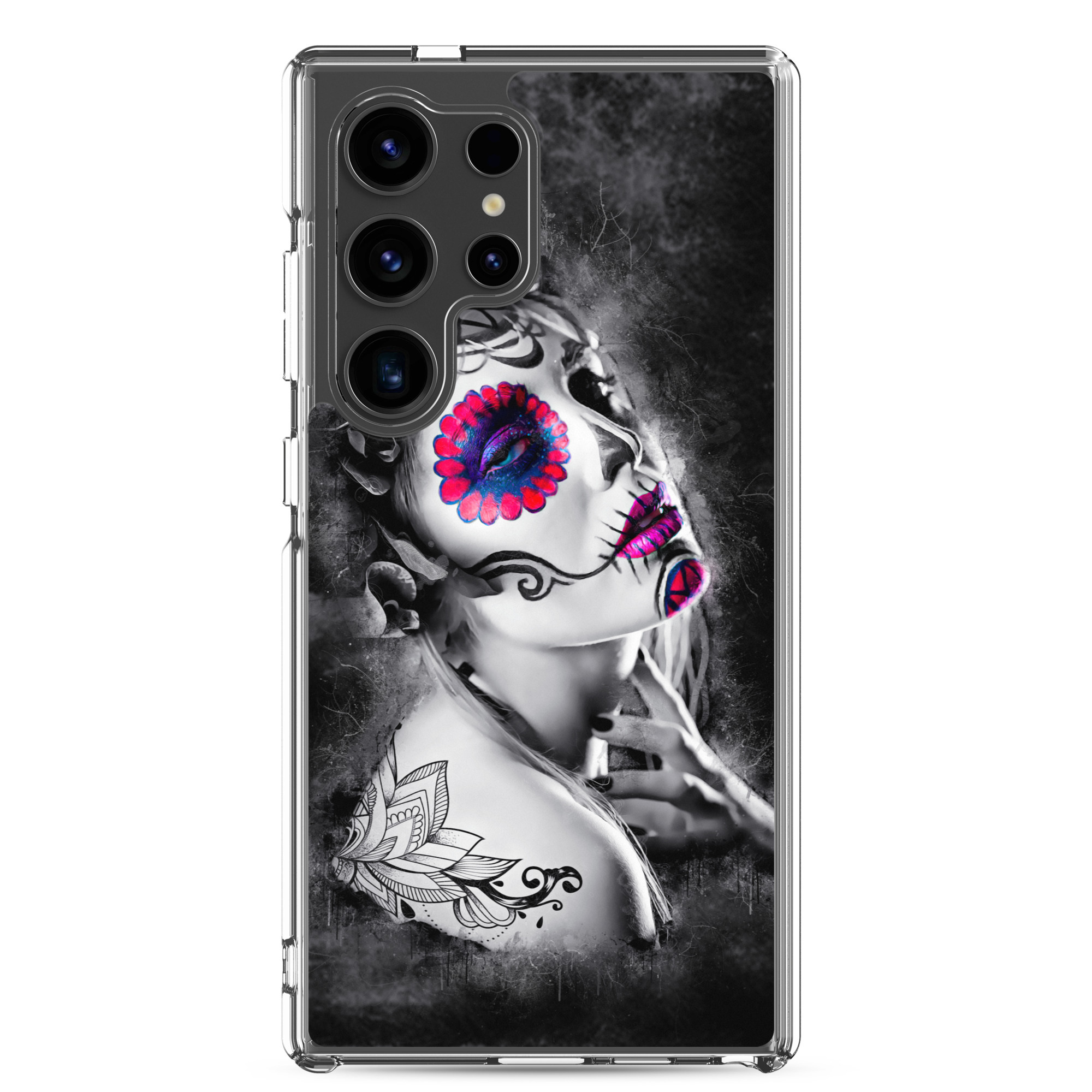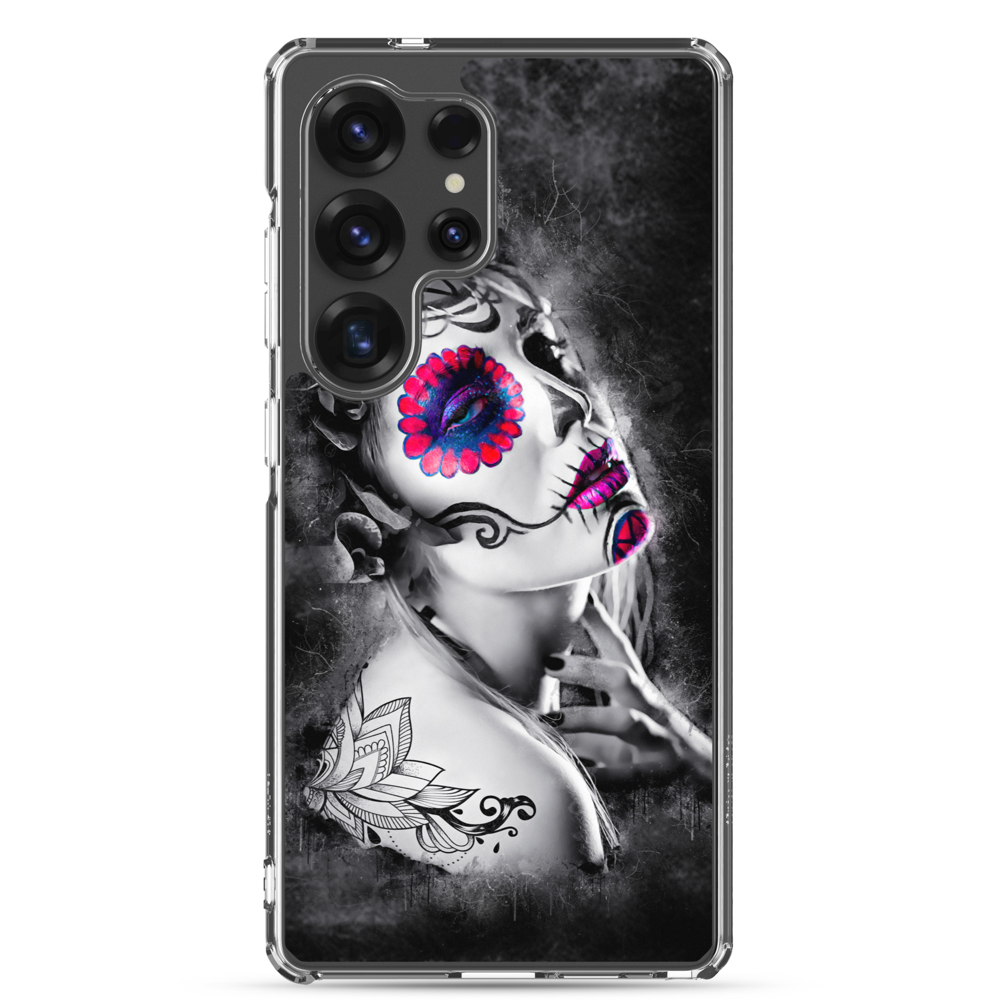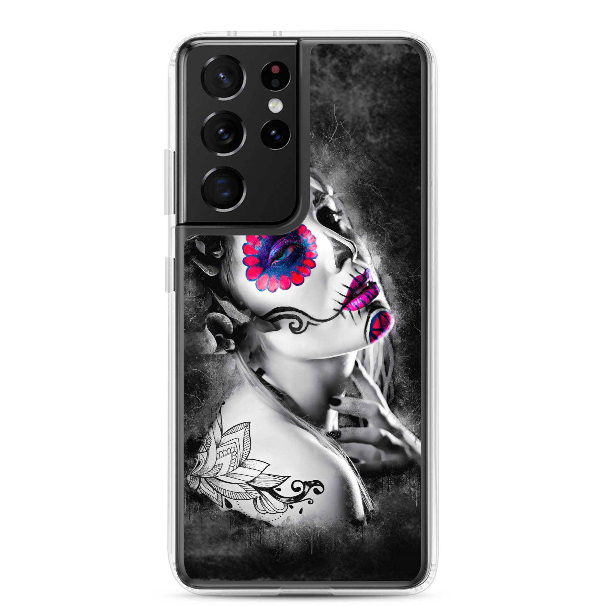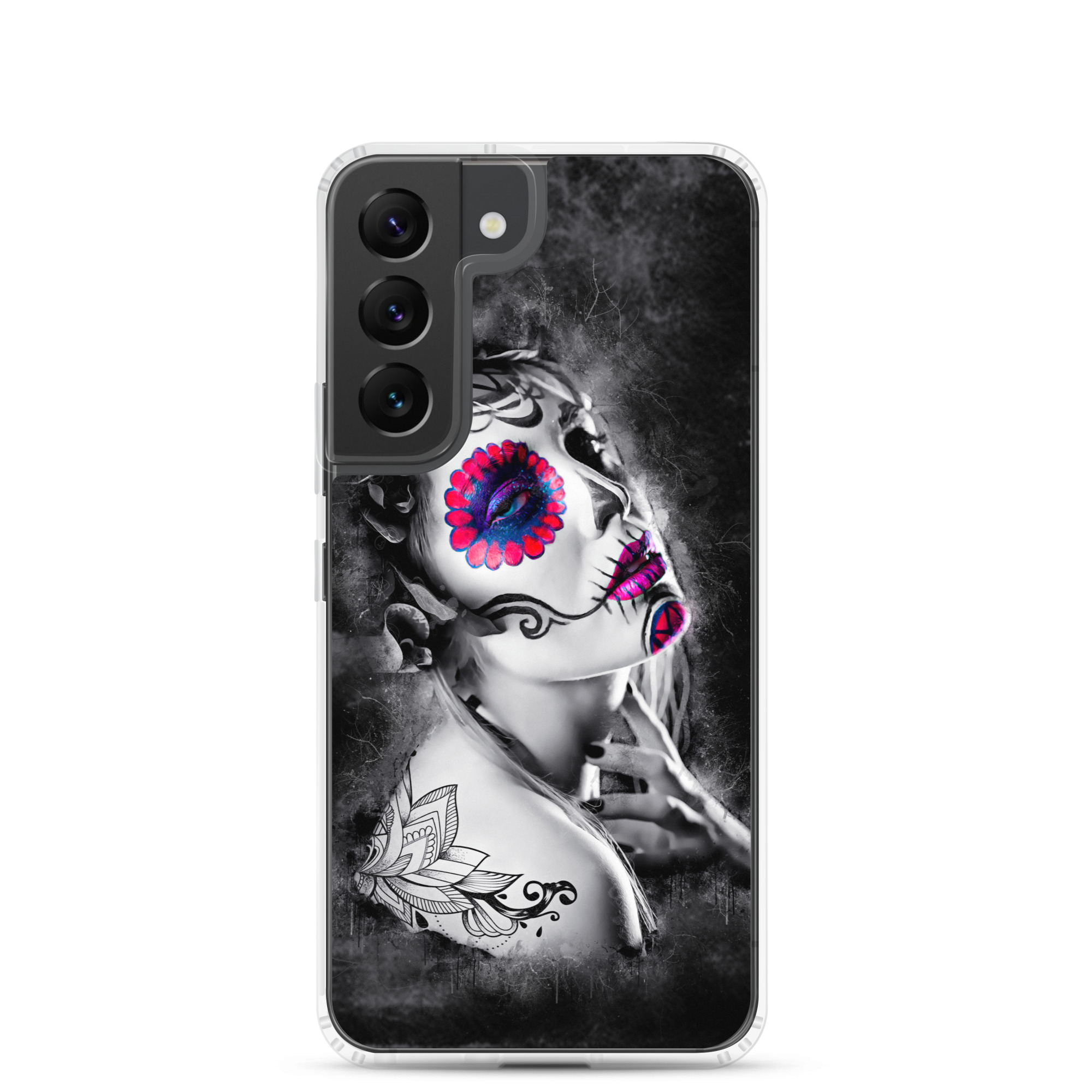 Mobilskal som passar Samsung Galaxy-modellerna med ett konstnärligt motiv på en ansiktsmålad kvinna som dekoration. Tillverkad i hög kvalitet och skyddar baksidan och sidorna på din telefon mot repor, smuts, olja och damm. Sidorna är genomskinliga och har färdiga hål för laddning, volym, hörlurar och på/avstängning. Skalet är väldigt slitstarkt och enkelt att ta av telefonen på grund av det följsamma materialet runtom. Kompatibla för trådlös laddning.