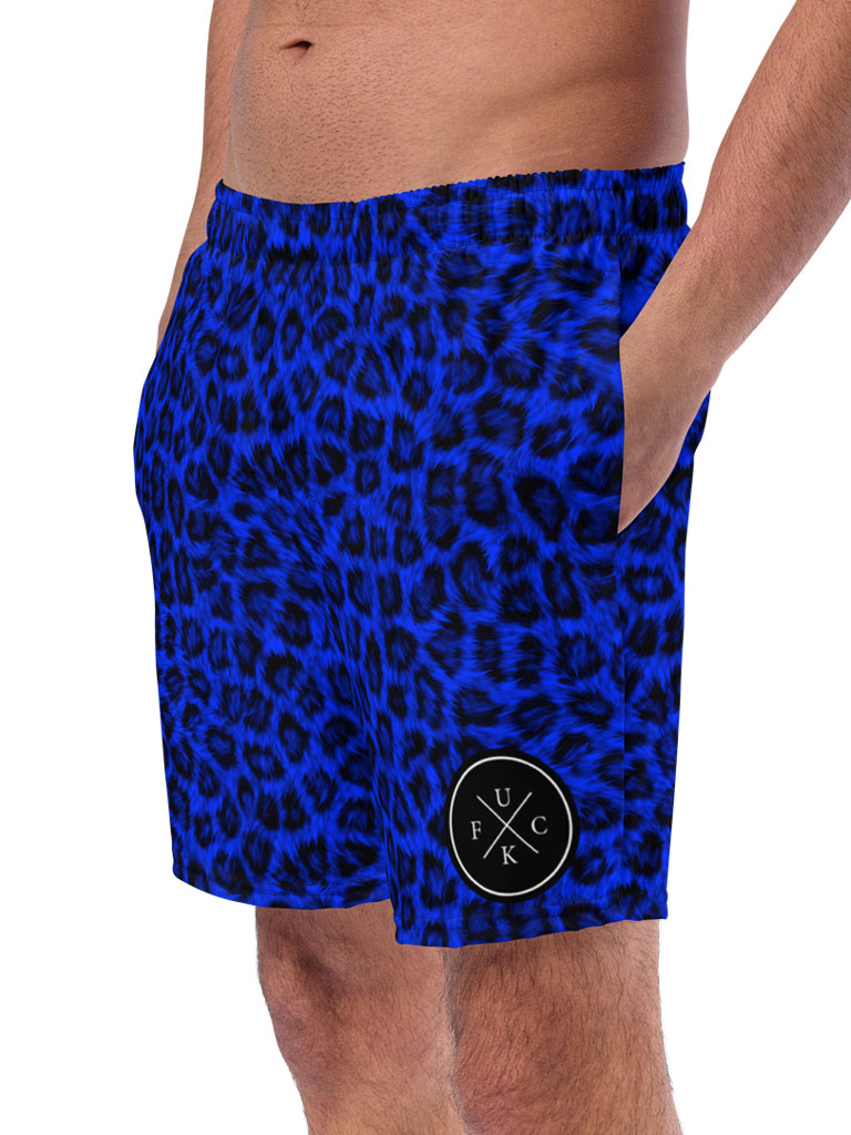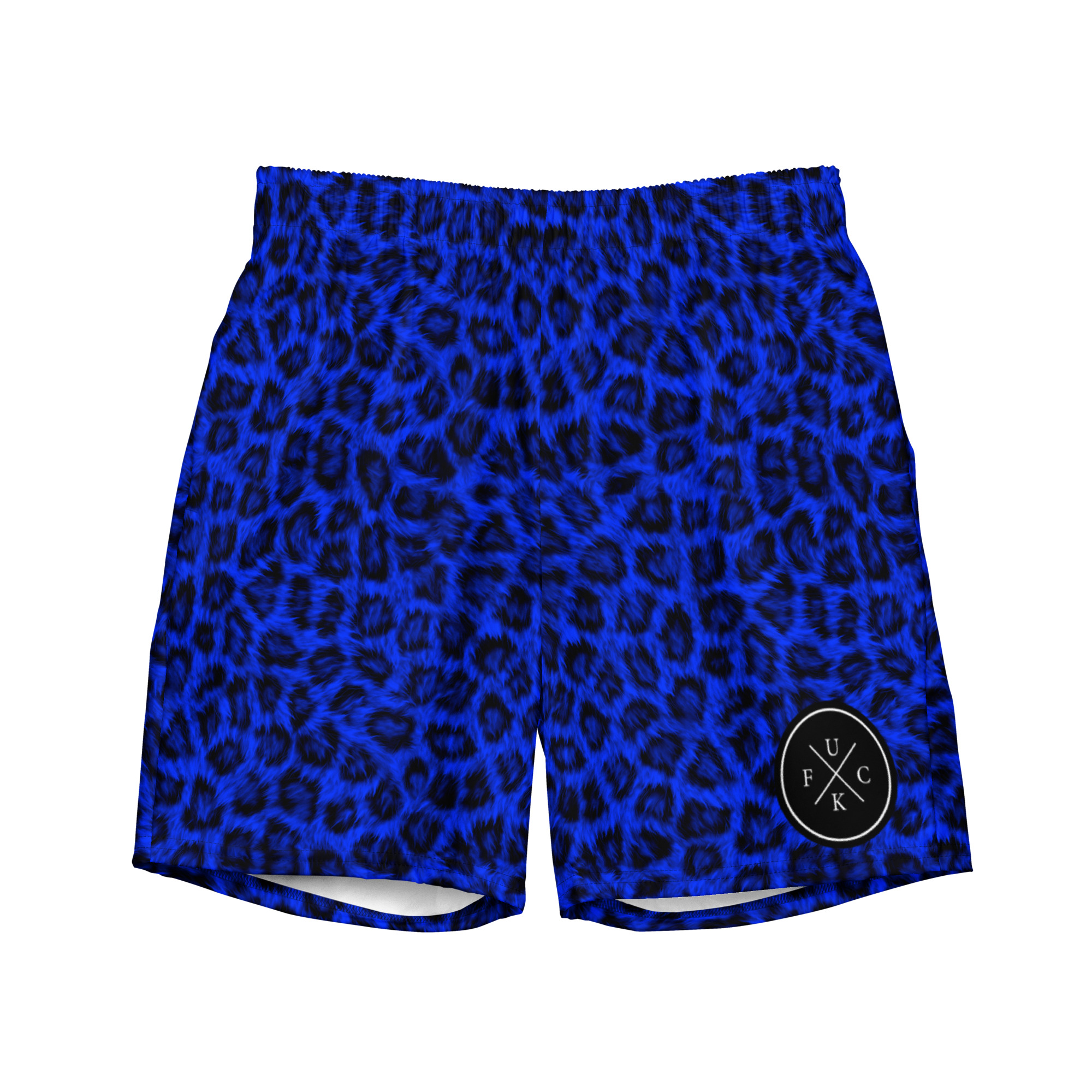Snygga badshorts med ett blått leopardmönster och texten ’Fuck’ som dekoration. Tillverkad i blandad polyester och spandex av hög kvalitet. På insidan finns en liten ficka för dina värdesaker. Tyget har fyrvägsstretch för att följa kroppen perfekt. Shortsen har sidofickor med en insida av nät. Kommer garanterat dra blickarna till sig på stranden. Badshortsen trycks och sys sedan ihop exklusivt för hand och skickas till dig direkt från leverantören.