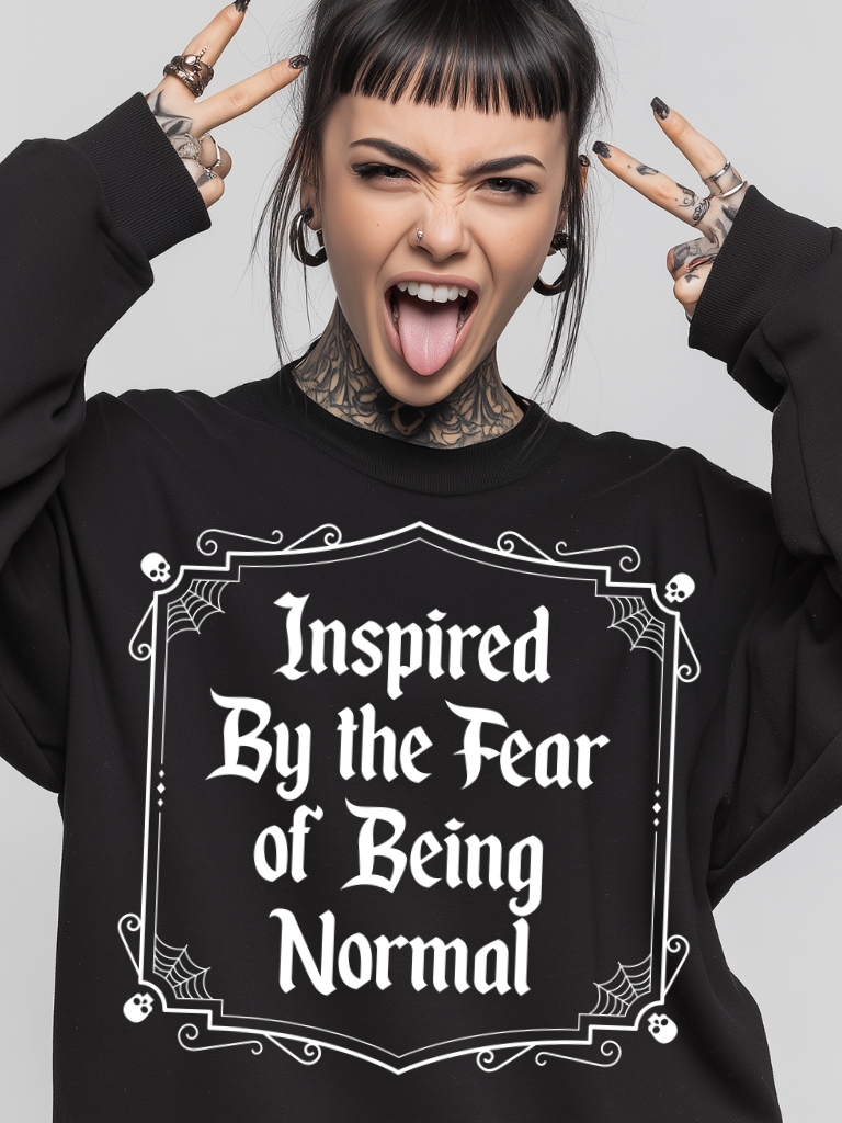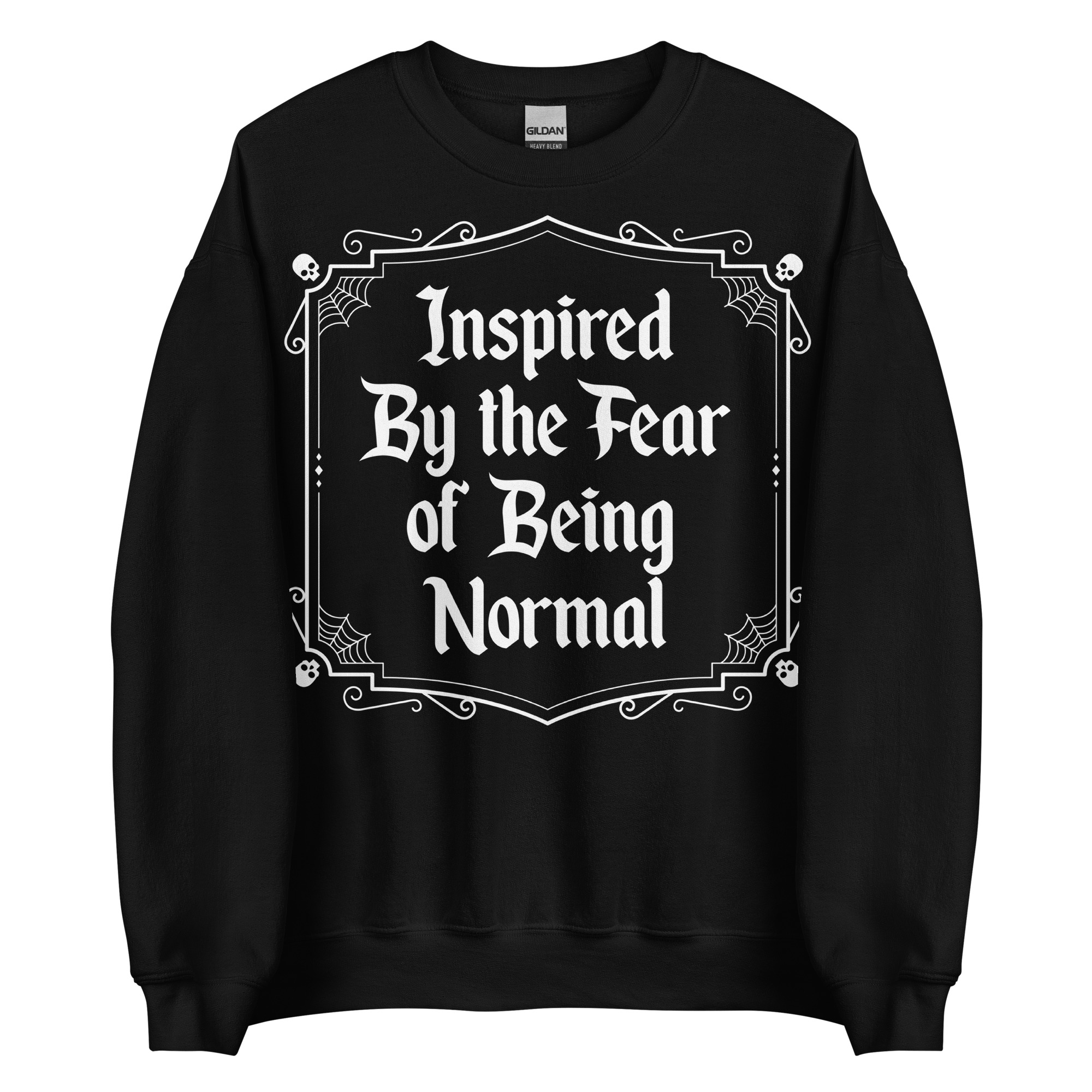 Varm och skön sweatshirt i svart tillverkad i blandad bomull/polyester med ett stort alternativt tryck med texten ’Inspired by the fear of being normal’ som dekoration på framsidan. Tröjan passar perfekt till både män och kvinnor som INTE är normala.