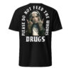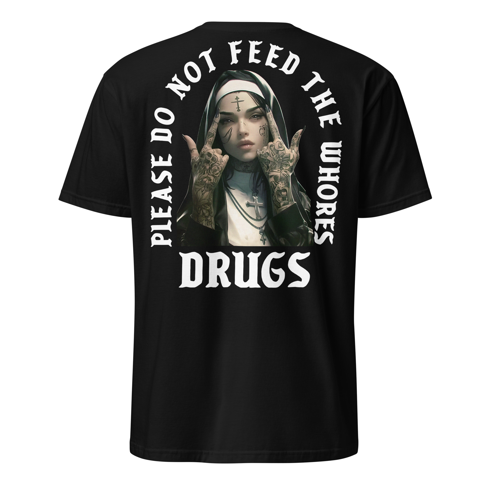 T-shirt i svart med en nunna som visar långfingrarna och texten ’Please do not feed the whores drugs’ som dekoration på baksidan. Passar perfekt till kvinnor och män som älskar attityd. Tröjan är tillverkad i en supermjuk kvalitet i 100% bomull.