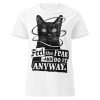 Semi-fitted t-shirt i vitt med en svart katt och texten ’Feel the fear and do it anyway’ som dekoration på framsidan. Passar perfekt till kvinnor som inte bangar utmaningar. Tröjan är tillverkad i en supermjuk kvalitet i 100% bomull.