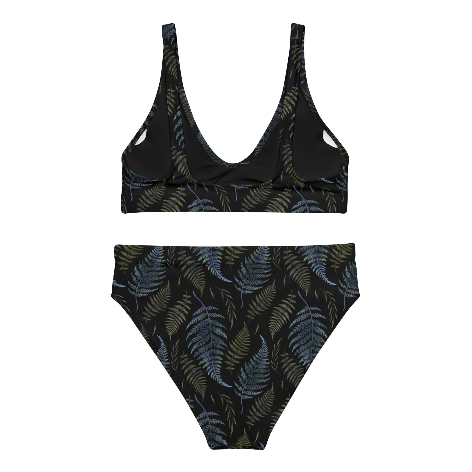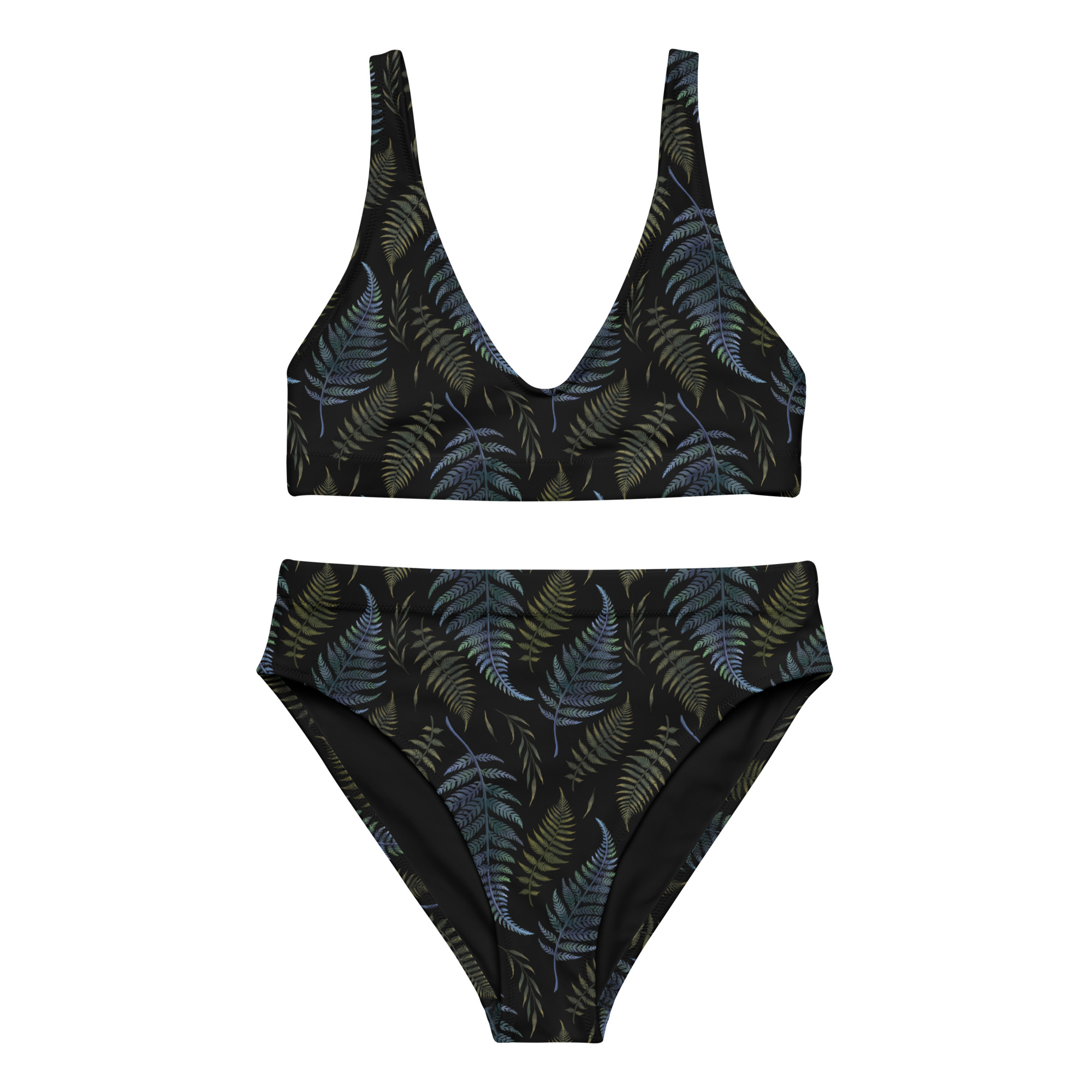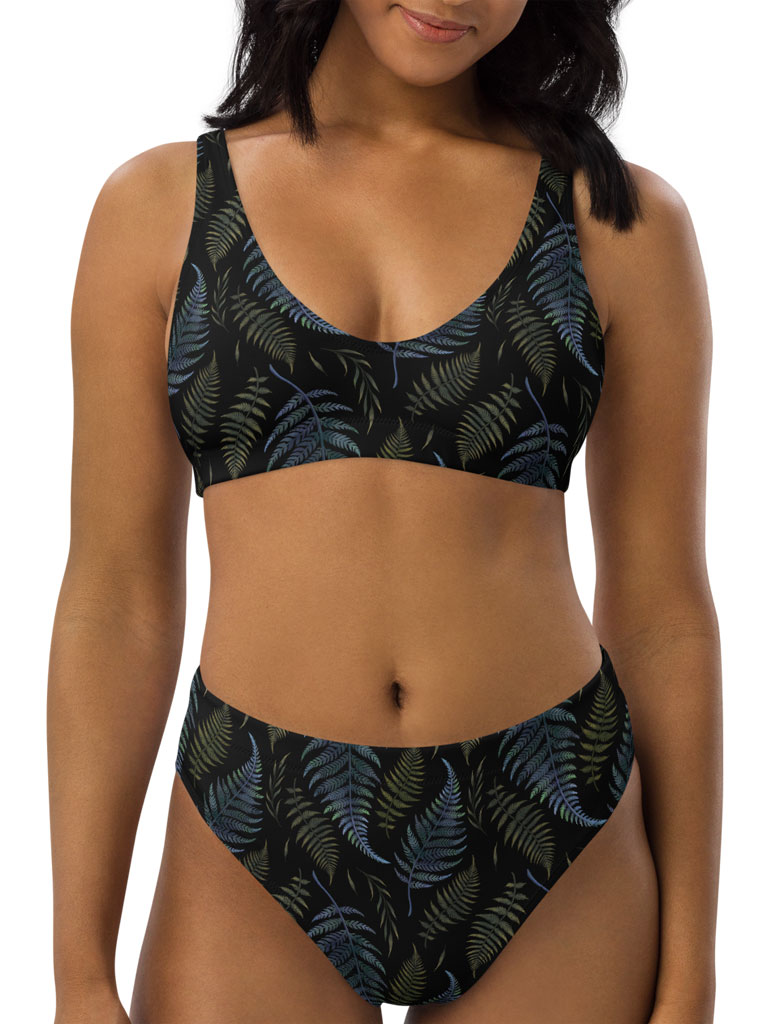 Underbar bikini dekorerad med ormbunksblad på både fram- och baksidan. Tillverkad i en mjuk och stretchig blandning av återvunnen polyester och elastan som omsluter kroppen perfekt. Överdelen har inlägg som du kan välja att ta ur eller använda. Denna bikini trycks och sys sedan ihop för hand exklusivt efter beställning.