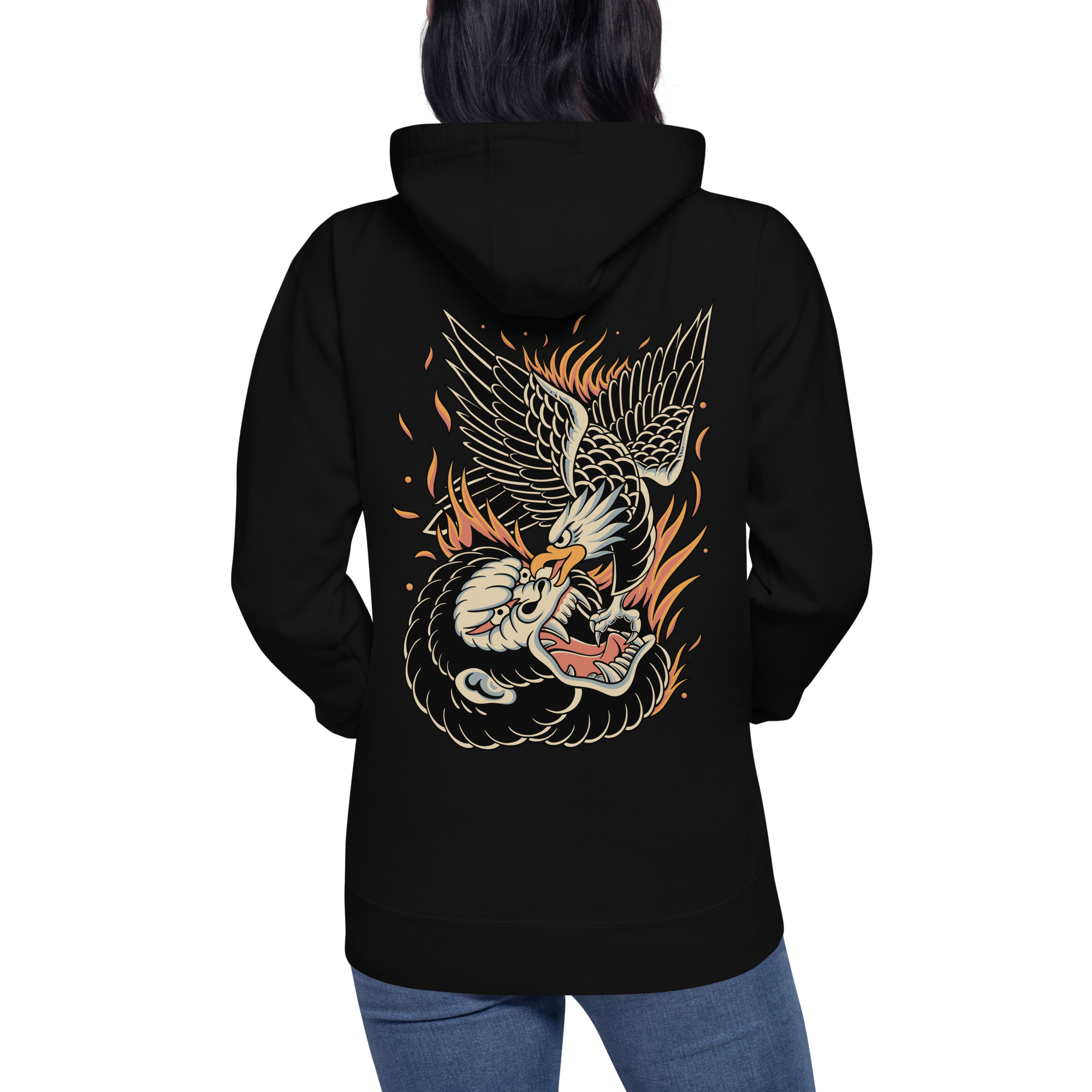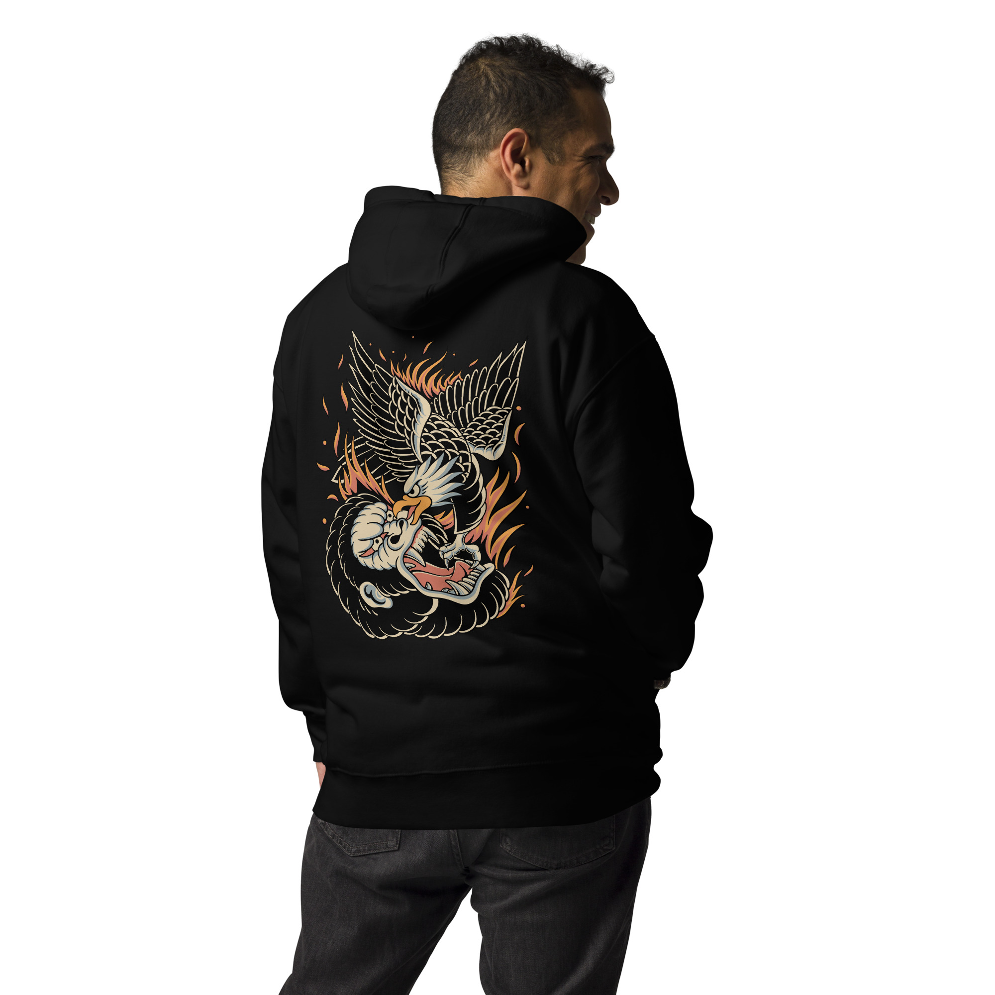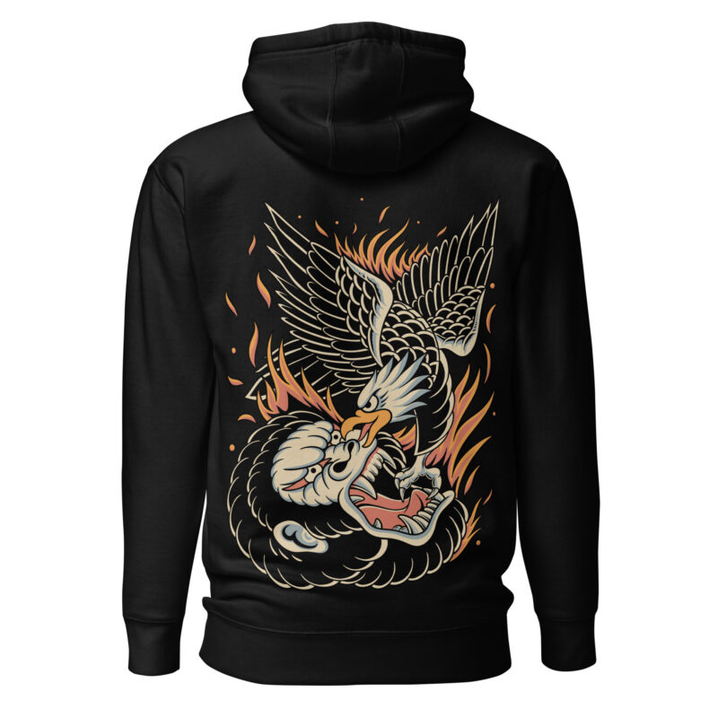 Hoodie i unisex-modell tillverkad i en extra fin kvalitet i blandad bomull och polyester. På baksidan återfinns ett stort tatueringsmotiv i old school-stil med en örn som attackerar en gorilla som dekoration. Hoodien håller värmen riktigt bra och har ett otroligt mjukt tyg. Passar alla oss som älskar den alternativa stilen.