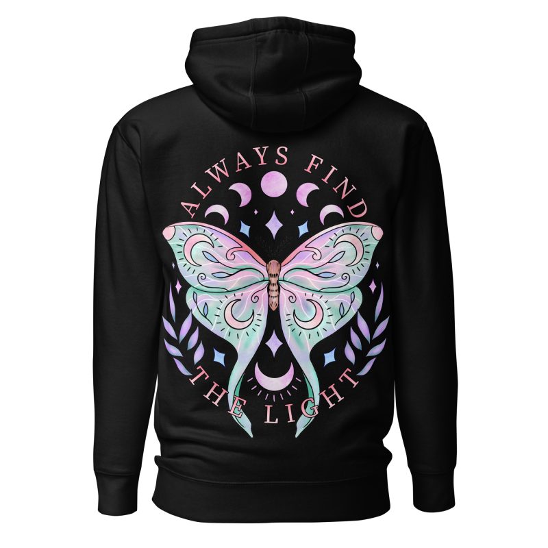 Hoodie i unisex-modell tillverkad i en extra fin kvalitet i blandad bomull och polyester. På baksidan återfinns ett pastellfärgat motiv med en fjäril och texten ’Always find the light’ som dekoration. Hoodien håller värmen riktigt bra och har ett otroligt mjukt tyg. Passar alla oss som älskar alternativa kläder.