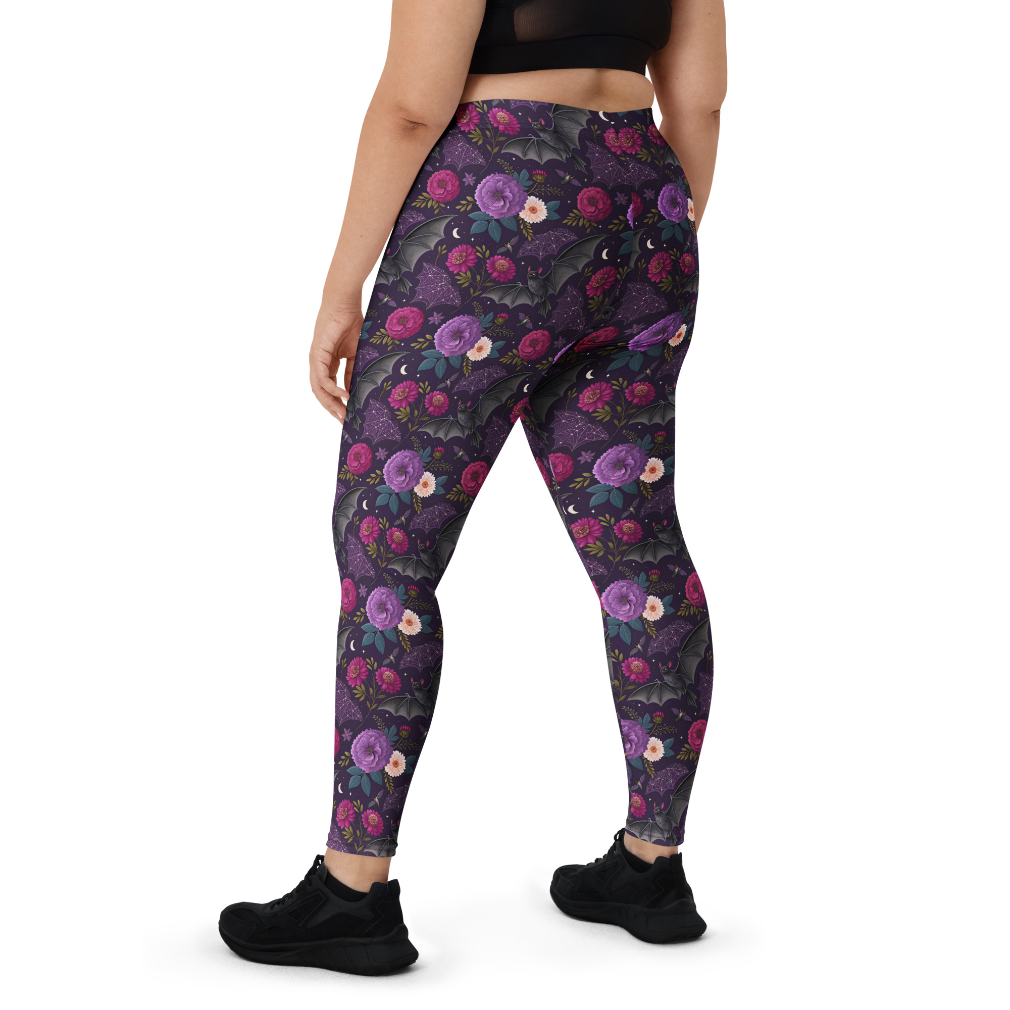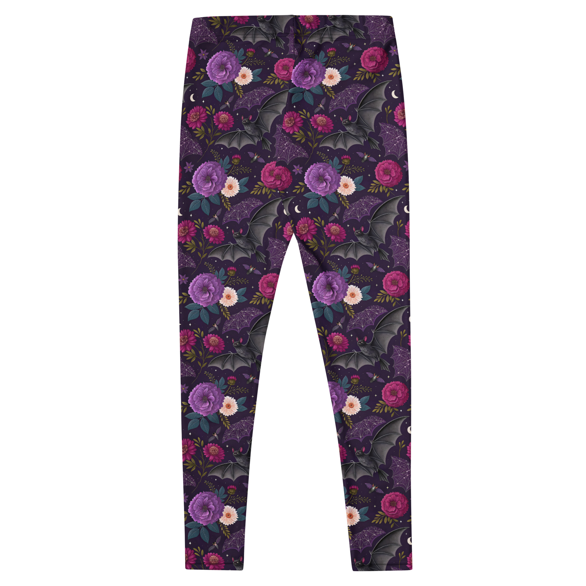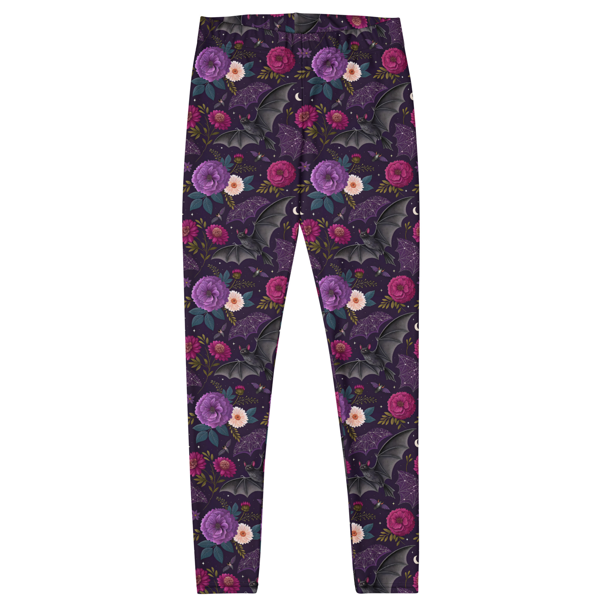 Sköna leggings med fladdermöss och mörka blommor som tryck. Tillverkade i en stretchig blandning av polyester och spandex som aldrig tappar sina elastiska egenskaper. Det mjuka materialet mikrofiber och det elastiska bandet i midjan gör att de omsluter kroppen perfekt. Efter beställning trycks tyget och sys sedan ihop för hand exklusivt för dig.