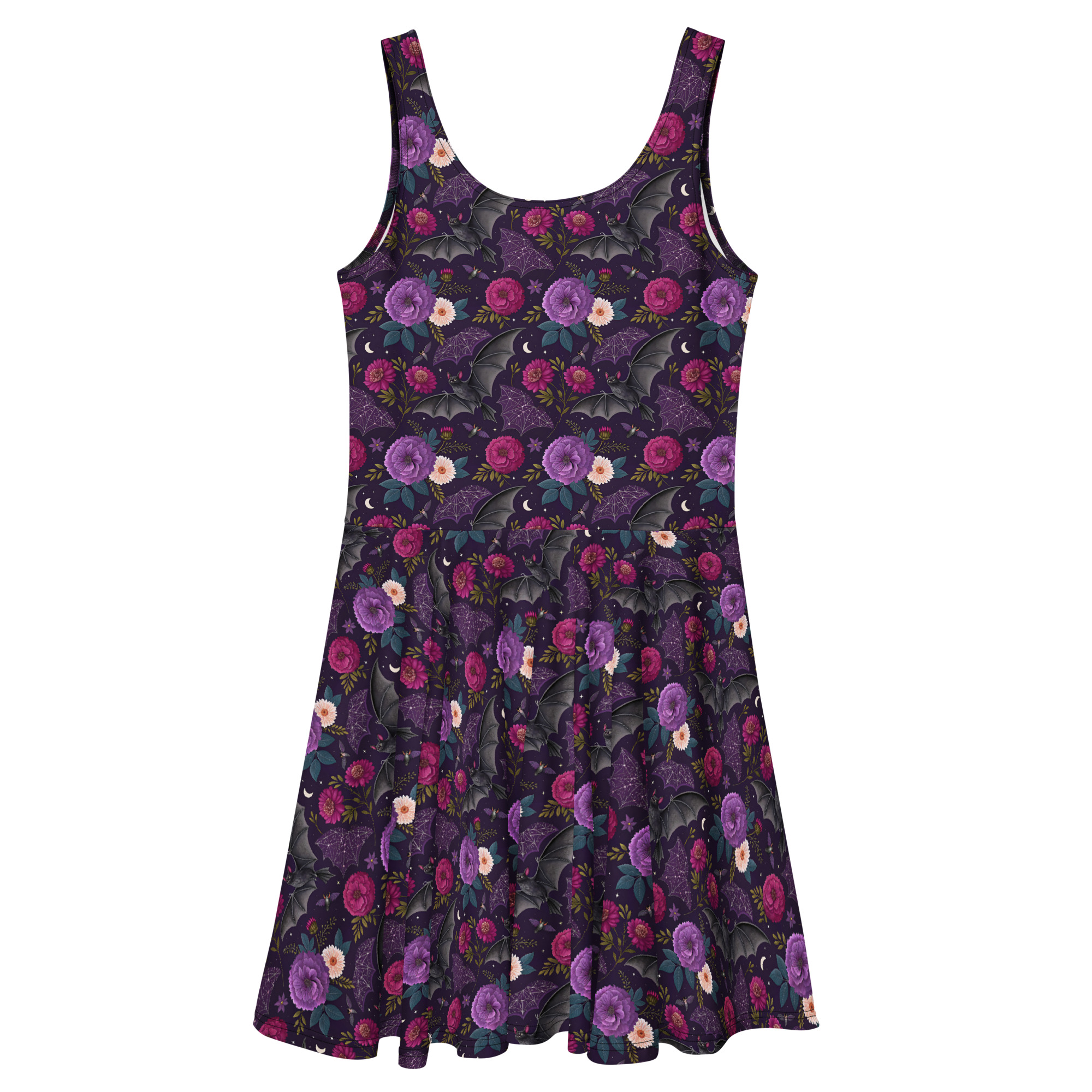Fantastisk klänning med fladdermöss och blommor som dekoration på både fram- och baksidan. Tillverkad i en mjuk och följsam blandning av polyester och spandex som omsluter kroppen perfekt. Klänningen är både komfortabel med mycket stretch och tyget är väldigt mjukt. Denna klänning trycks och sys sedan ihop exklusivt för hand efter din beställning.