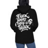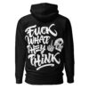 Hoodie i unisex-modell tillverkad i en extra fin kvalitet i blandad bomull och polyester. På baksidan återfinns en dödskalle, en skeletthand som visar långfingret och texten ’Fuck what they think’ som dekoration. Hoodien håller värmen riktigt bra och har ett otroligt mjukt tyg.