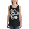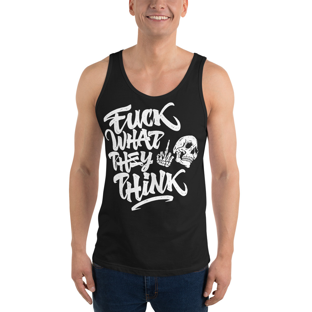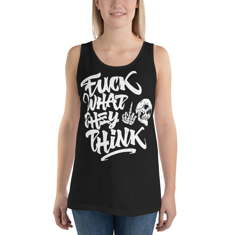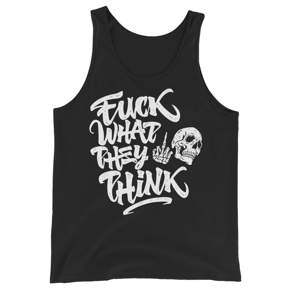 Linne i svart med en dödskalle, en skeletthand som visar långfingret och texten ’Fuck what they think’ som tryck på framsidan. Tillverkad i en skön kvalitet i 100% bomull. Passar perfekt till både män och kvinnor som älskar den alternativa stilen.