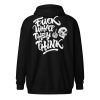 Hoodie med dragkedja med ett stort ryggtryck och ett mindre tryck på ena bröstet. Trycket består av en dödskalle, en skeletthand som visar långfingret och texten ’Fuck what they think’. Passar perfekt till både män och kvinnor, materialet är blandad bomull och polyester.