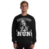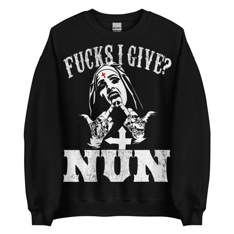 Varm och skön sweatshirt i svart tillverkad i blandad bomull/polyester med en nunna med attityd och texten ’Fucks I give? Nun’ som dekoration på framsidan. Tröjan passar perfekt till både män och kvinnor.