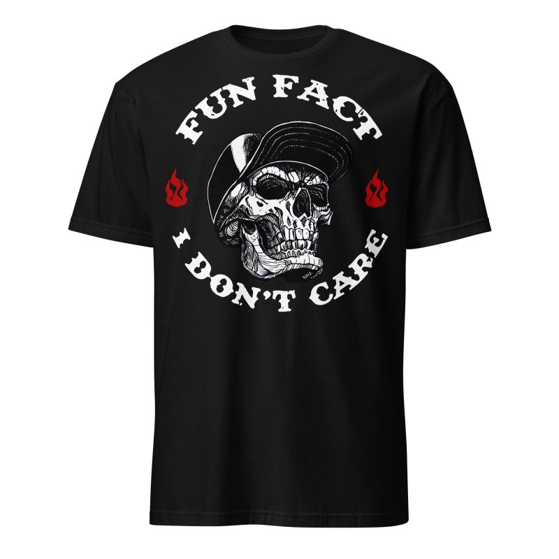 T-shirt i svart med en dödskalle med keps och texten ’Fun fact, I don’t care’ som dekoration på framsidan. Passar perfekt till kvinnor och män som älskar alternativa kläder. Tröjan är tillverkad i en supermjuk kvalitet i 100% bomull.