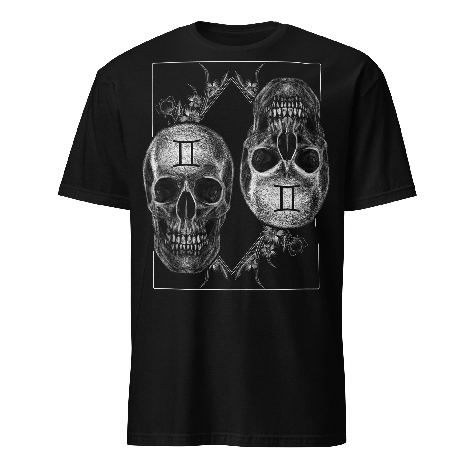 T-shirt i svart med två dödskallar som dekoration på framsidan. Passar perfekt till kvinnor och män som älskar alternativa kläder. Tröjan är tillverkad i en supermjuk kvalitet i 100% bomull.