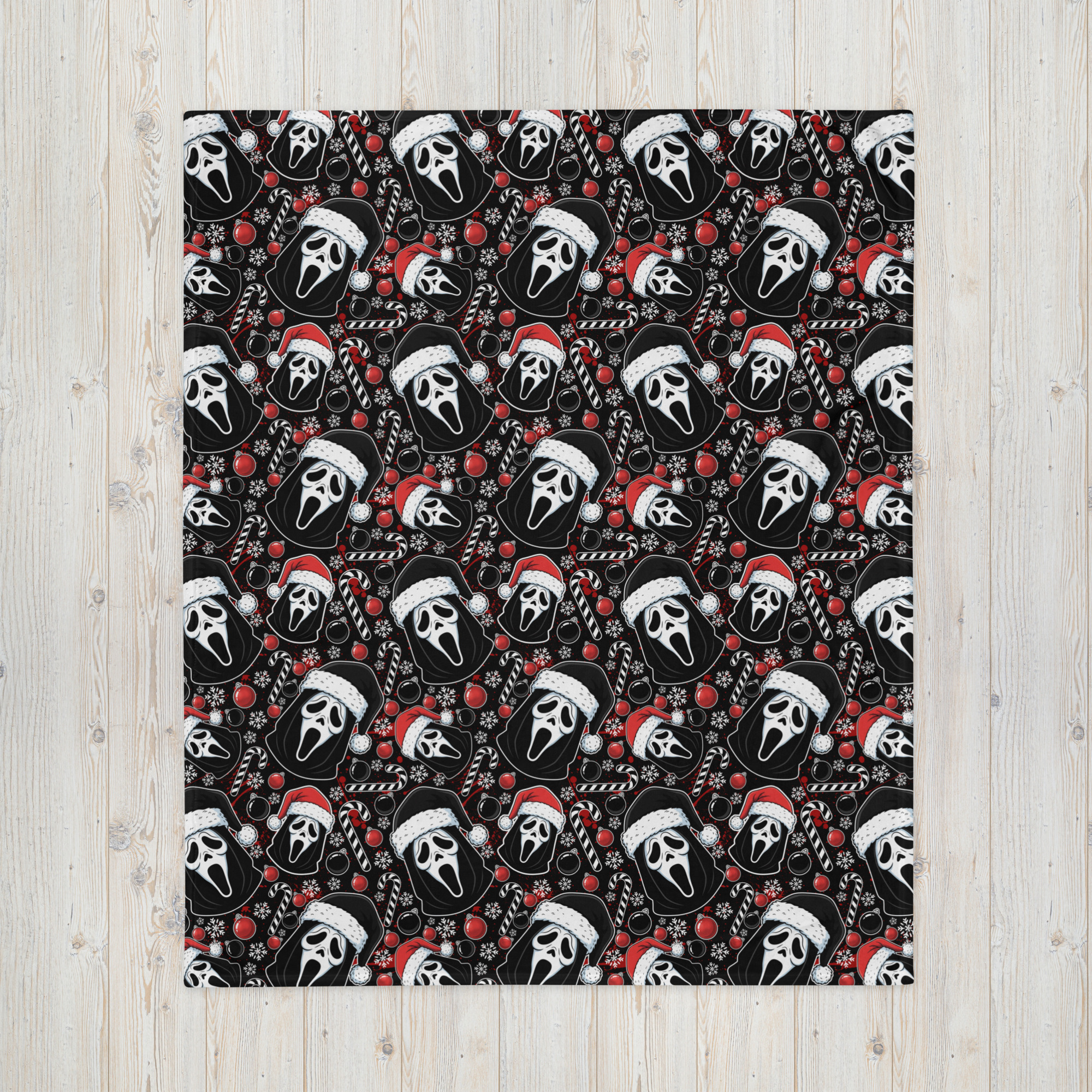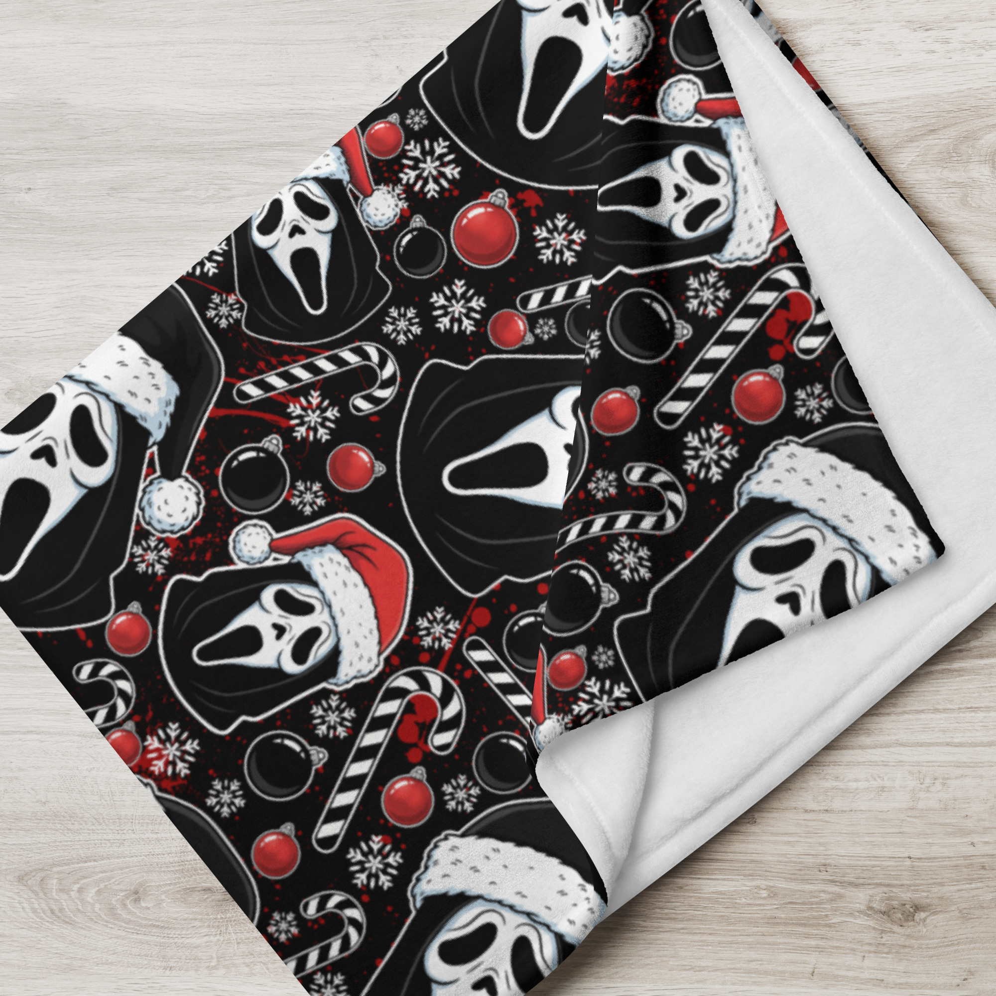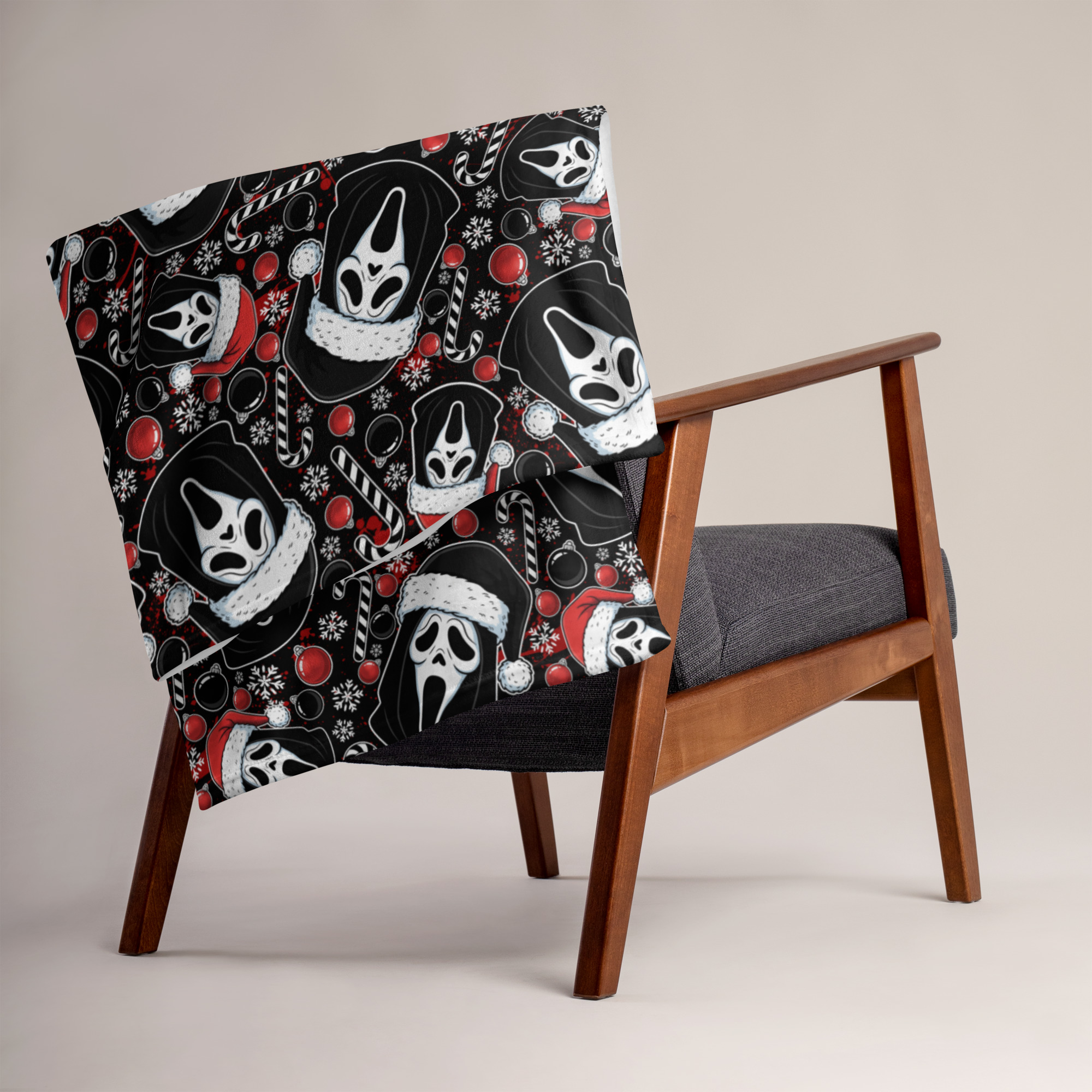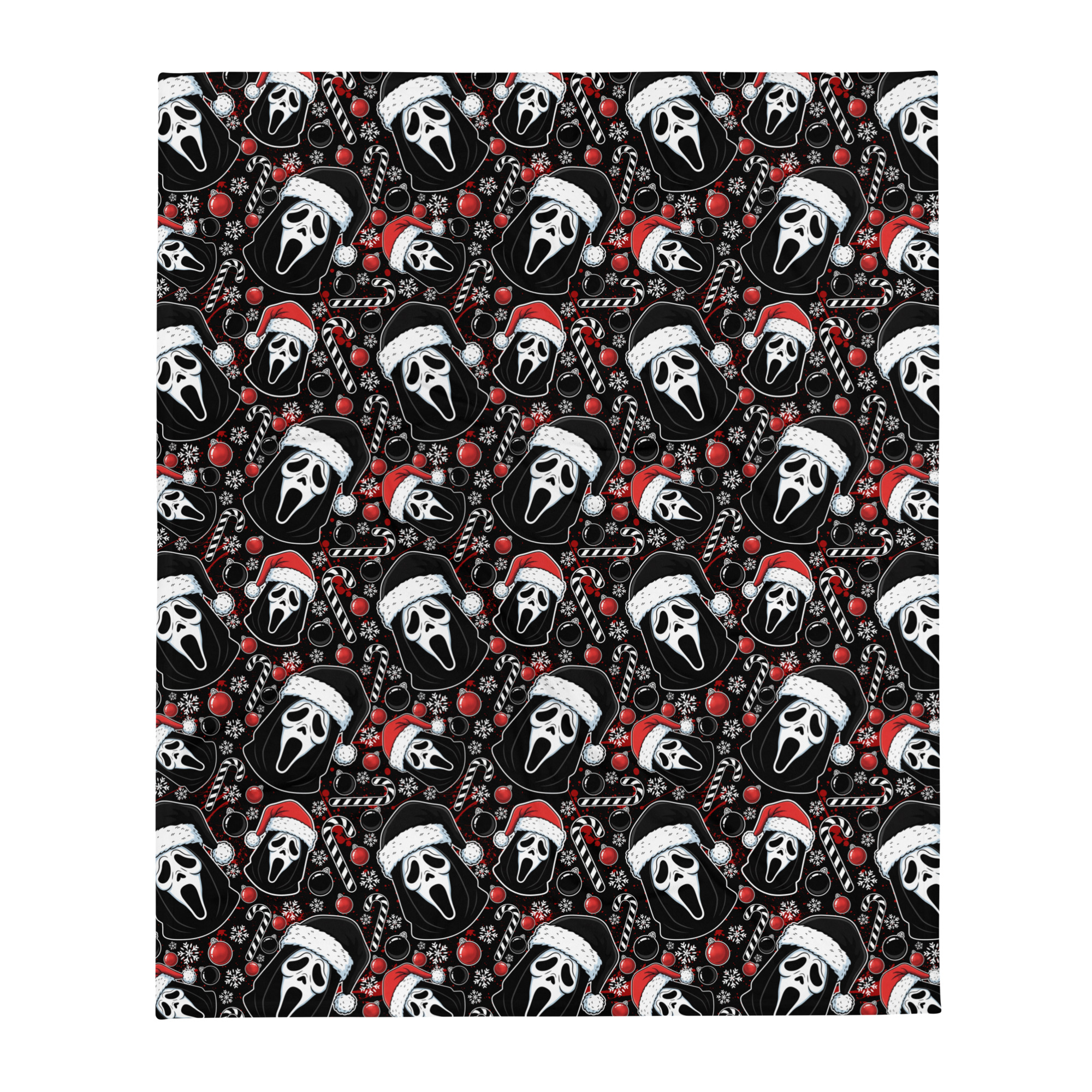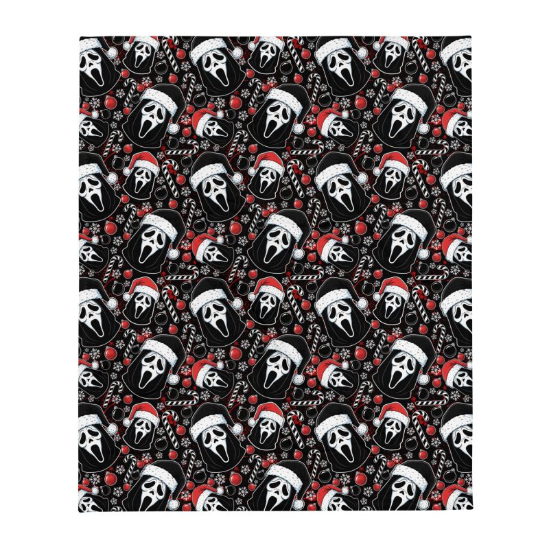 Snygg julpläd med mängder av julmotiv med Ghost face som dekoration på ena sidan. Materialet är 100% polyester i en otroligt mjuk och fin kvalitet. Pläden är både allergivänlig och tillverkad i ett brandsäkert material. Storleken är 127×153 cm. Baksidan är lika mjuk och skön som framsidan i en vit färg.