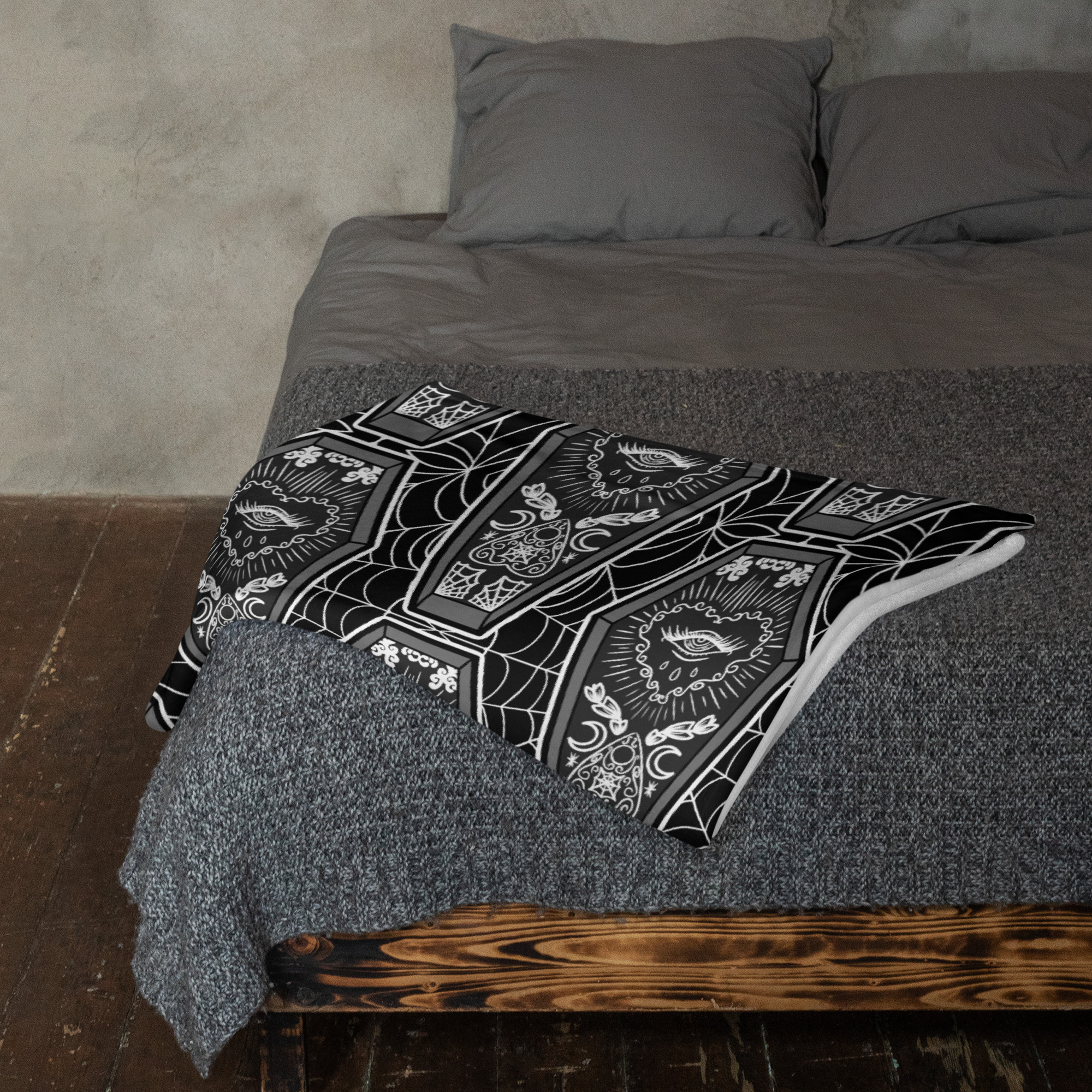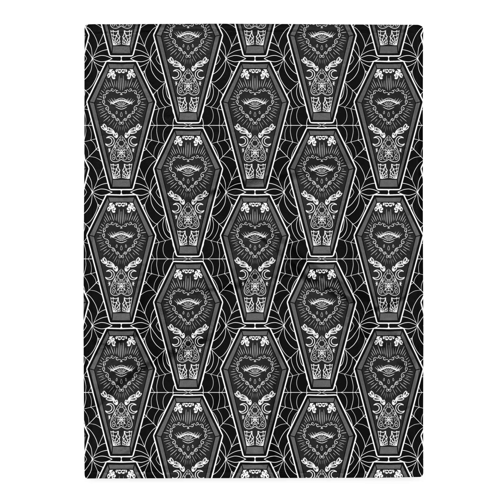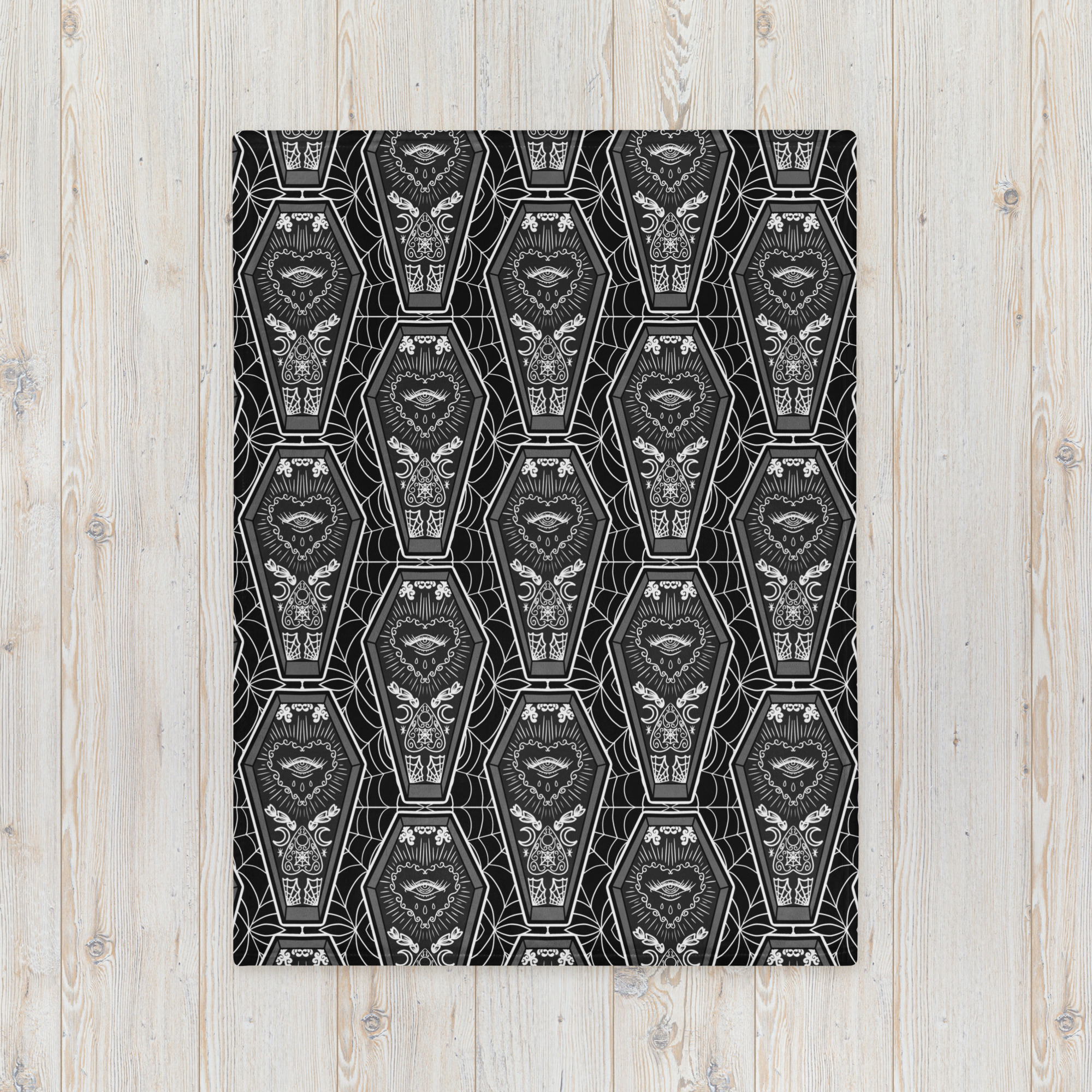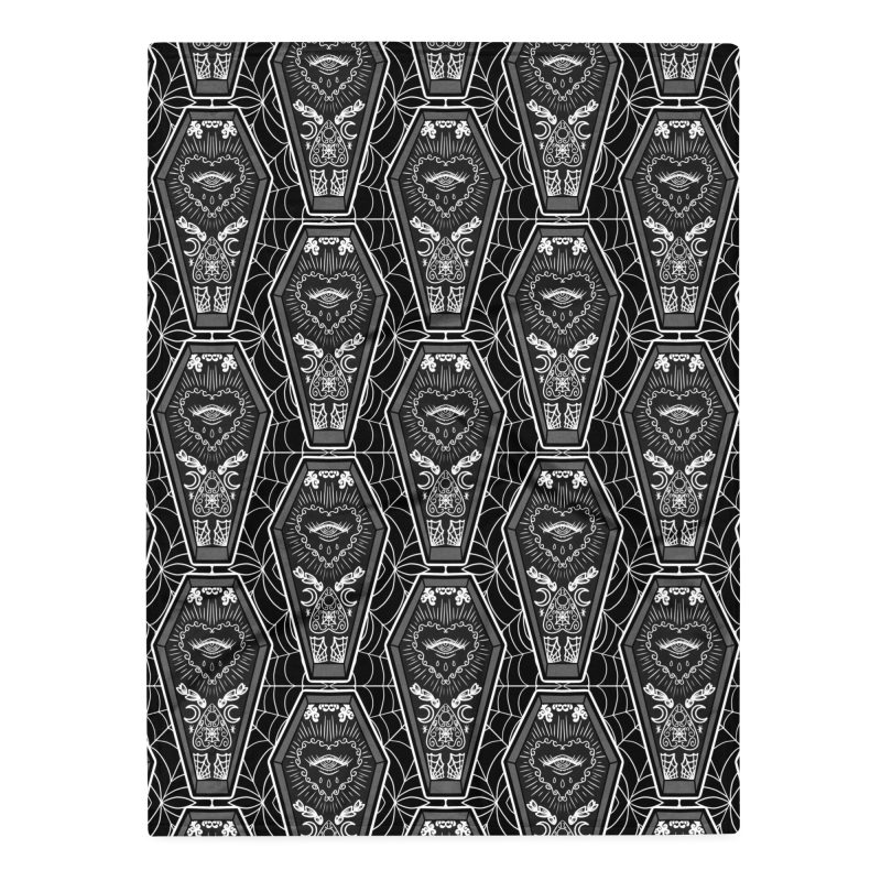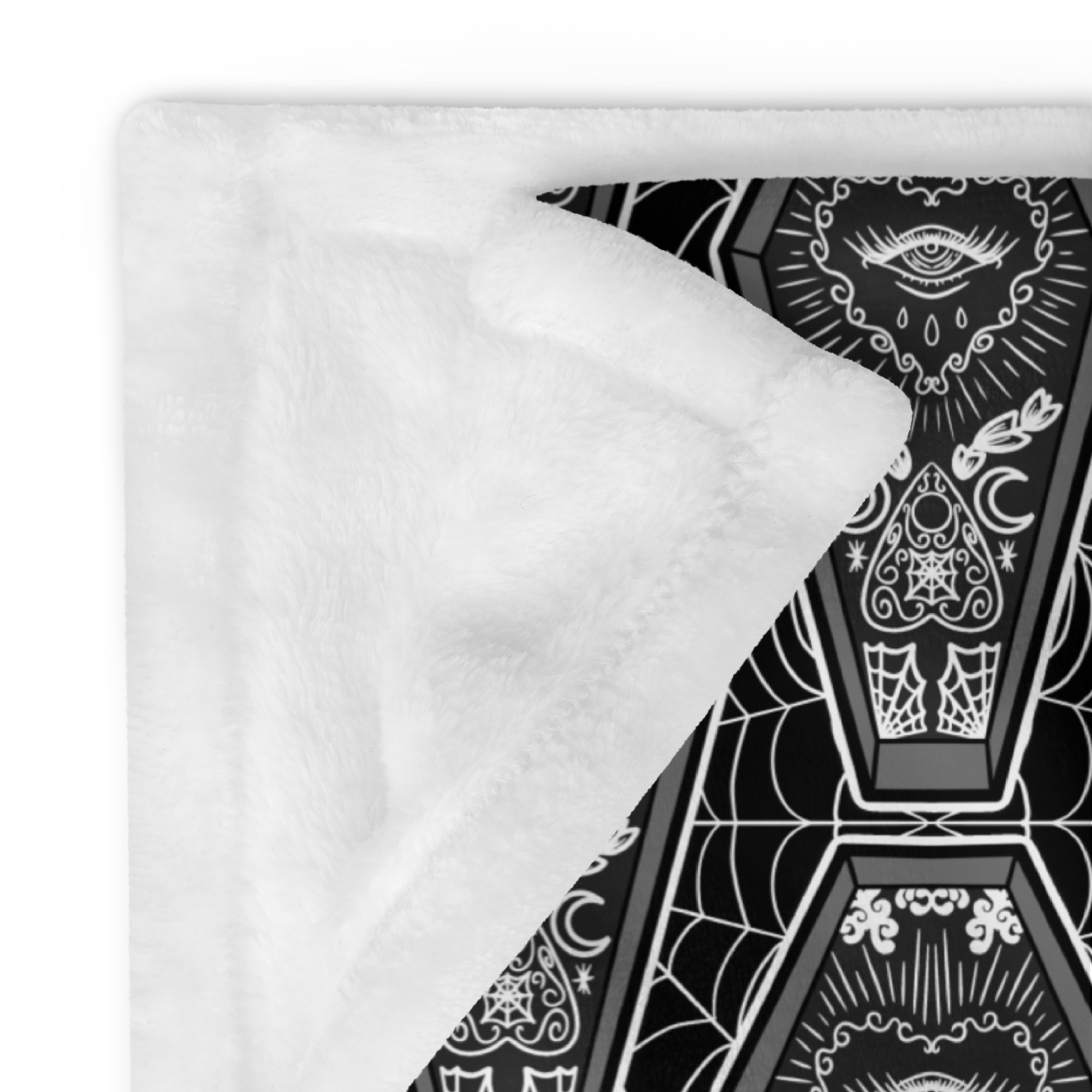 Snygg pläd med gotiska motiv med kistor och spindelnät som dekoration på ena sidan. Materialet är 100% polyester i en otroligt mjuk och fin kvalitet. Pläden är både allergivänlig och tillverkad i ett brandsäkert material. Storleken är 127×153 cm. Baksidan är lika mjuk och skön som framsidan i en vit färg.