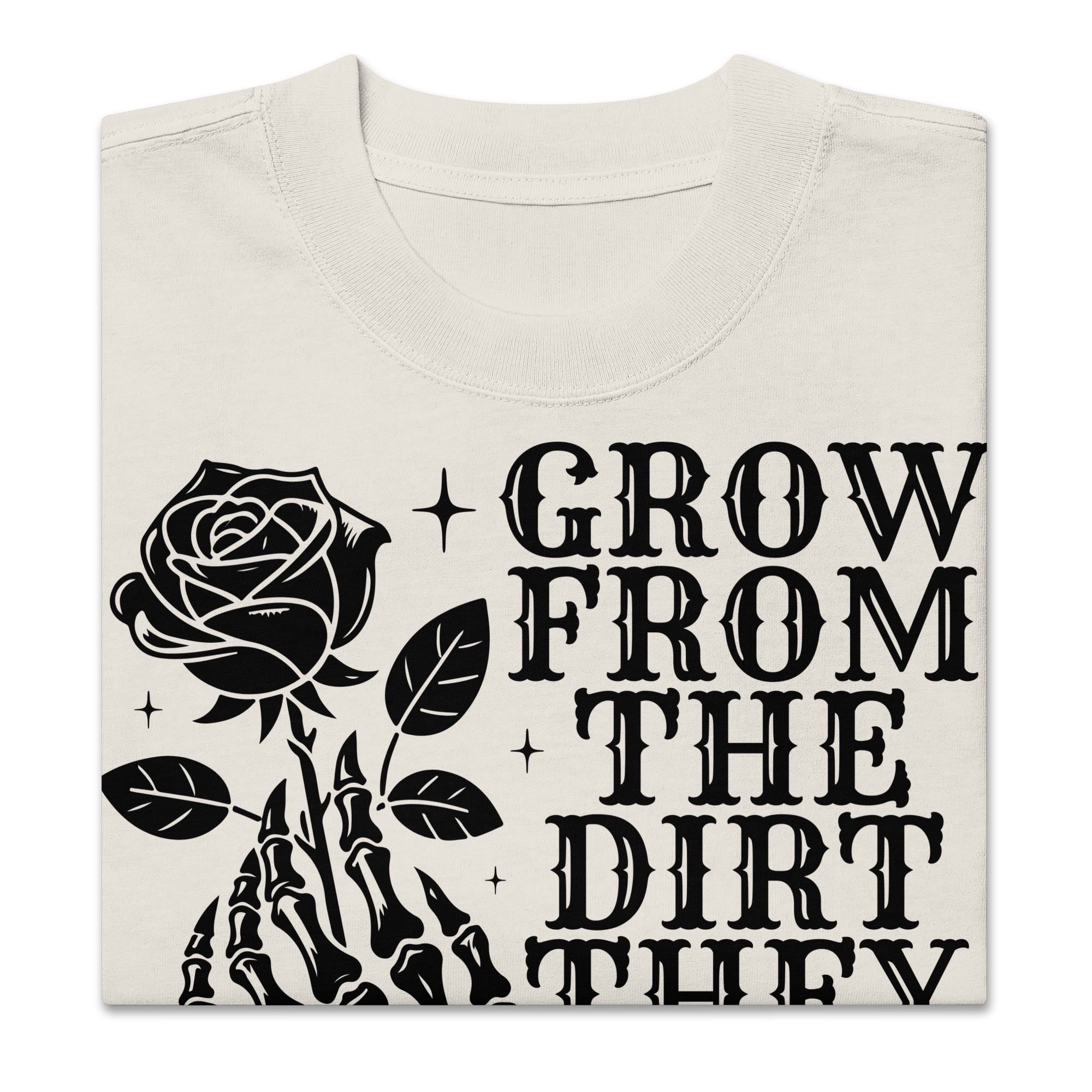 T-shirt i oversize-modell med en skeletthand som håller i en svart ros och texten ’Grow from the dirt they left you in’ som motiv på framsidan. Tröjan passar perfekt till både män och kvinnor som älskar den alternativa klädstilen. Materialet är kammad bomull av hög kvalitet i en snygg tvättad vintage-färg. T-shirten är förkrympt så den tappar inte form eller storlek efter tvätt. Kommer verkligen dra blickarna till sig med sin använda look.