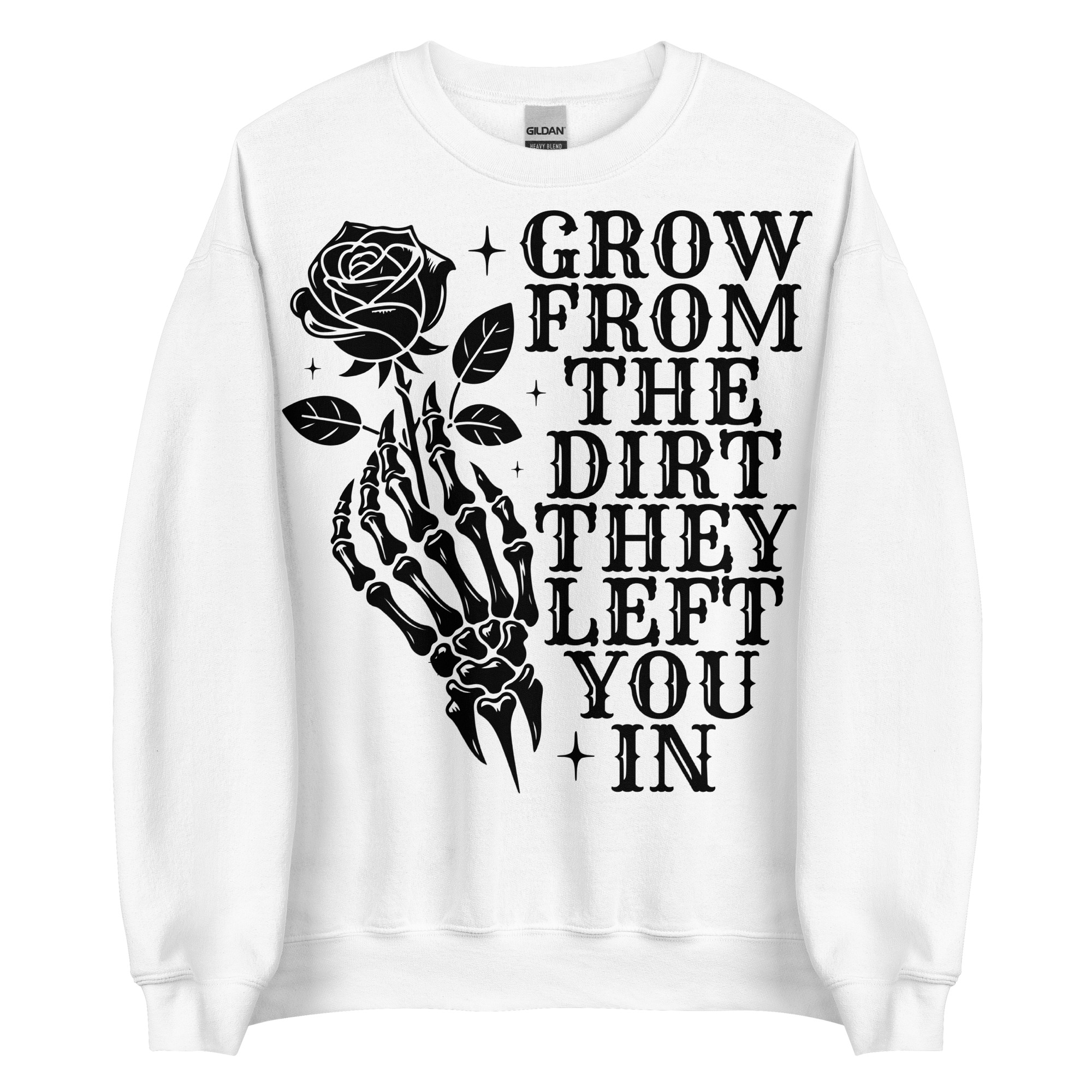 Varm och skön sweatshirt i svart tillverkad i blandad bomull/polyester med en skeletthand som håller i en svart ros och texten ’Grow from the dirt they left you in’ som dekoration på framsidan. Tröjan passar perfekt till både män och kvinnor som älskar den alternativa stilen.