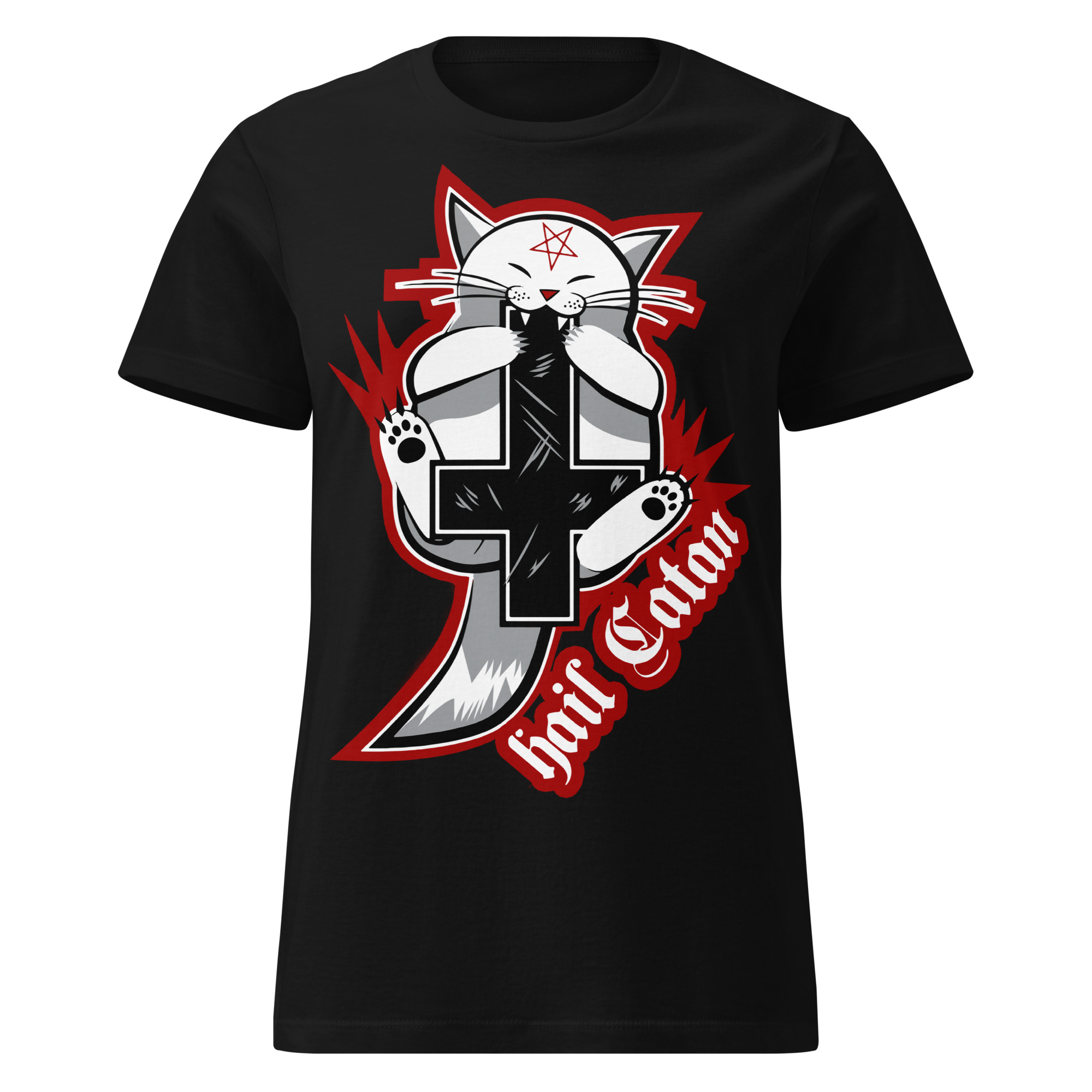 Semi-fitted t-shirt i svart med en katt med ett upp- och nervänt kors och texten ’Hail Catan’ som dekoration på framsidan. Passar perfekt till kvinnor som älskar den alternativa stilen. Tröjan är tillverkad i en fin kvalitet i 100% bomull.