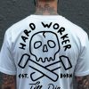 T-shirt i vitt med en stor dödskalle och texten ’Hard worker till die’ som tryck på baksidan. Passar perfekt till både män och kvinnor och är tillverkad i en supermjuk kvalitet i 100% bomull.