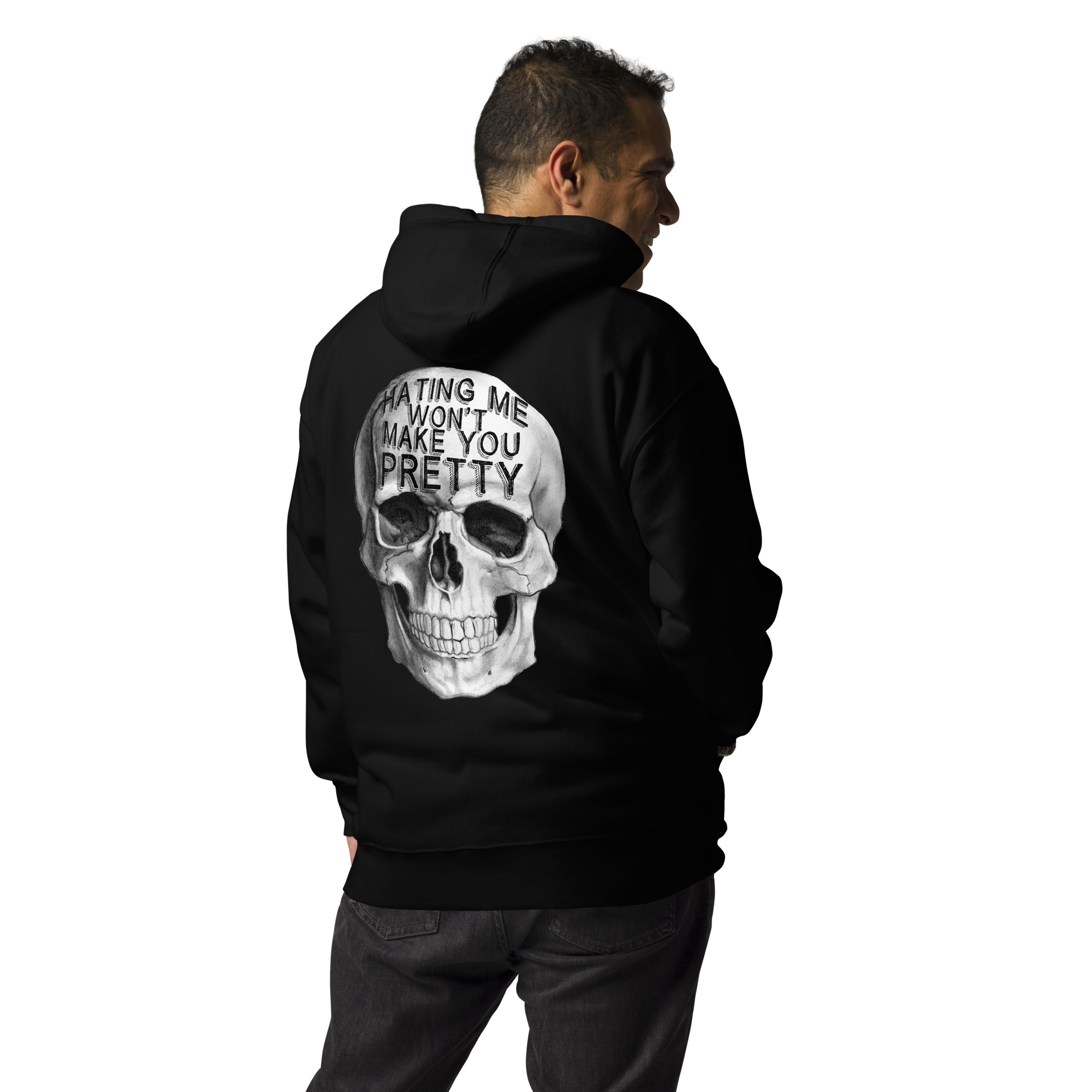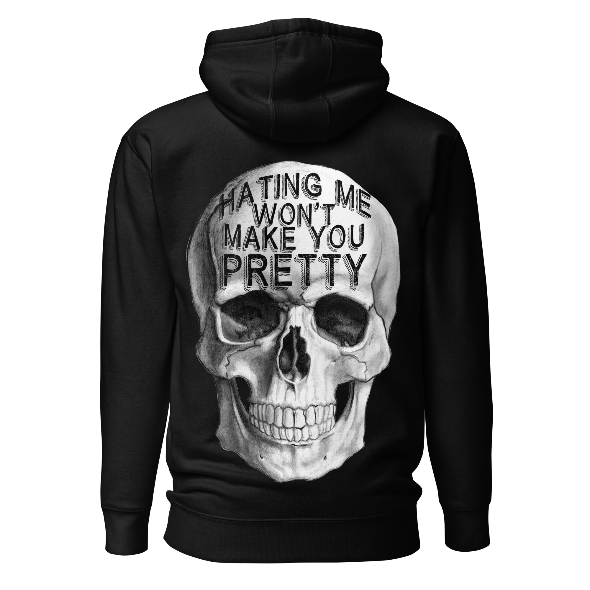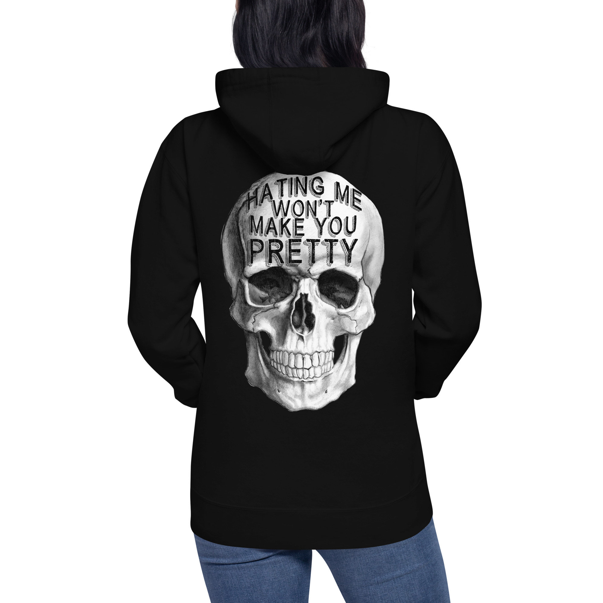 Hoodie i unisex-modell tillverkad i en extra fin kvalitet i blandad bomull och polyester. På ryggen finns en stor detaljrik dödskalle med texten ’Hating me won’t make you pretty’ som dekoration. Hoodien håller värmen riktigt bra och har ett otroligt mjukt tyg.