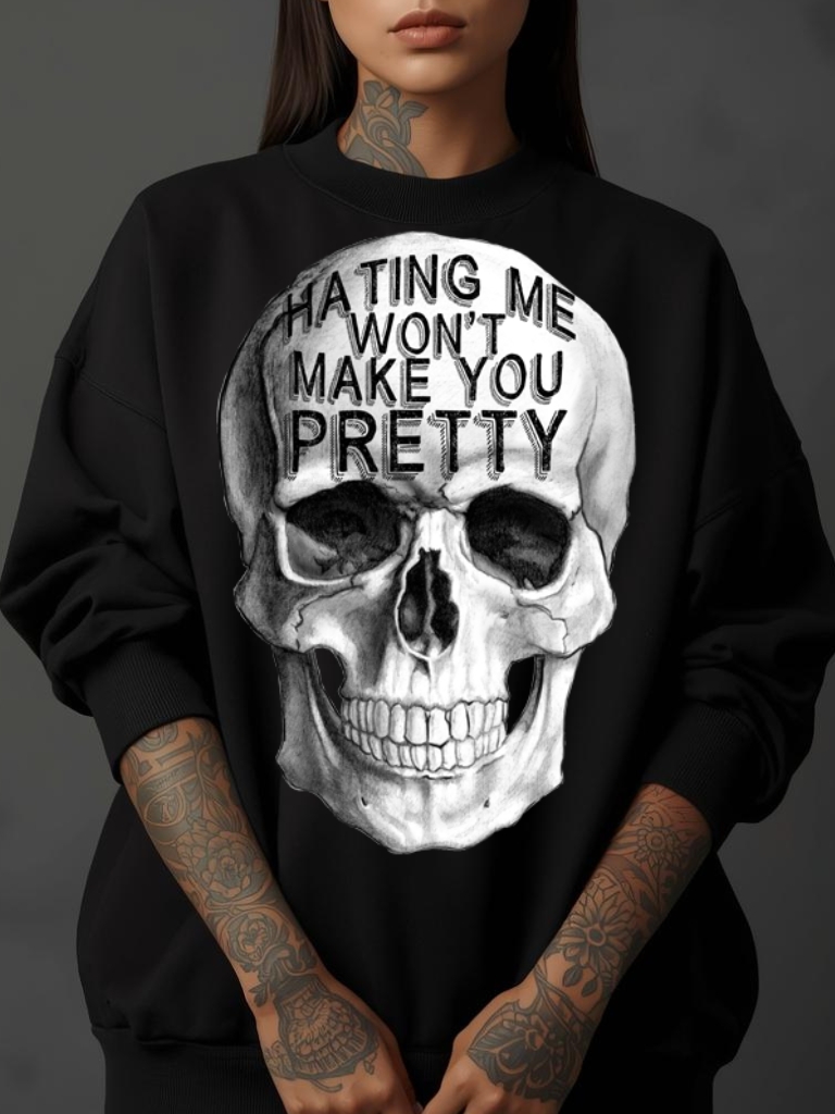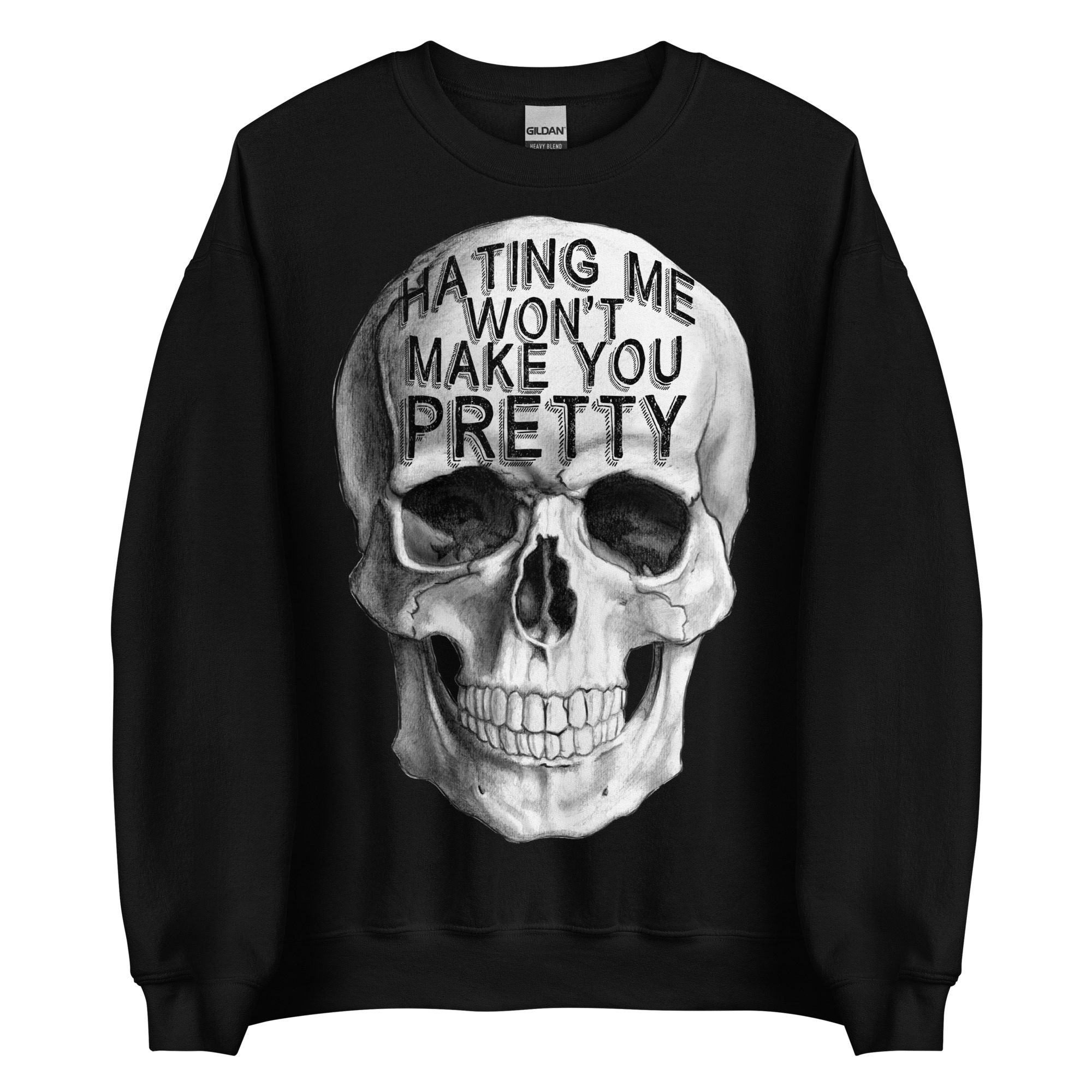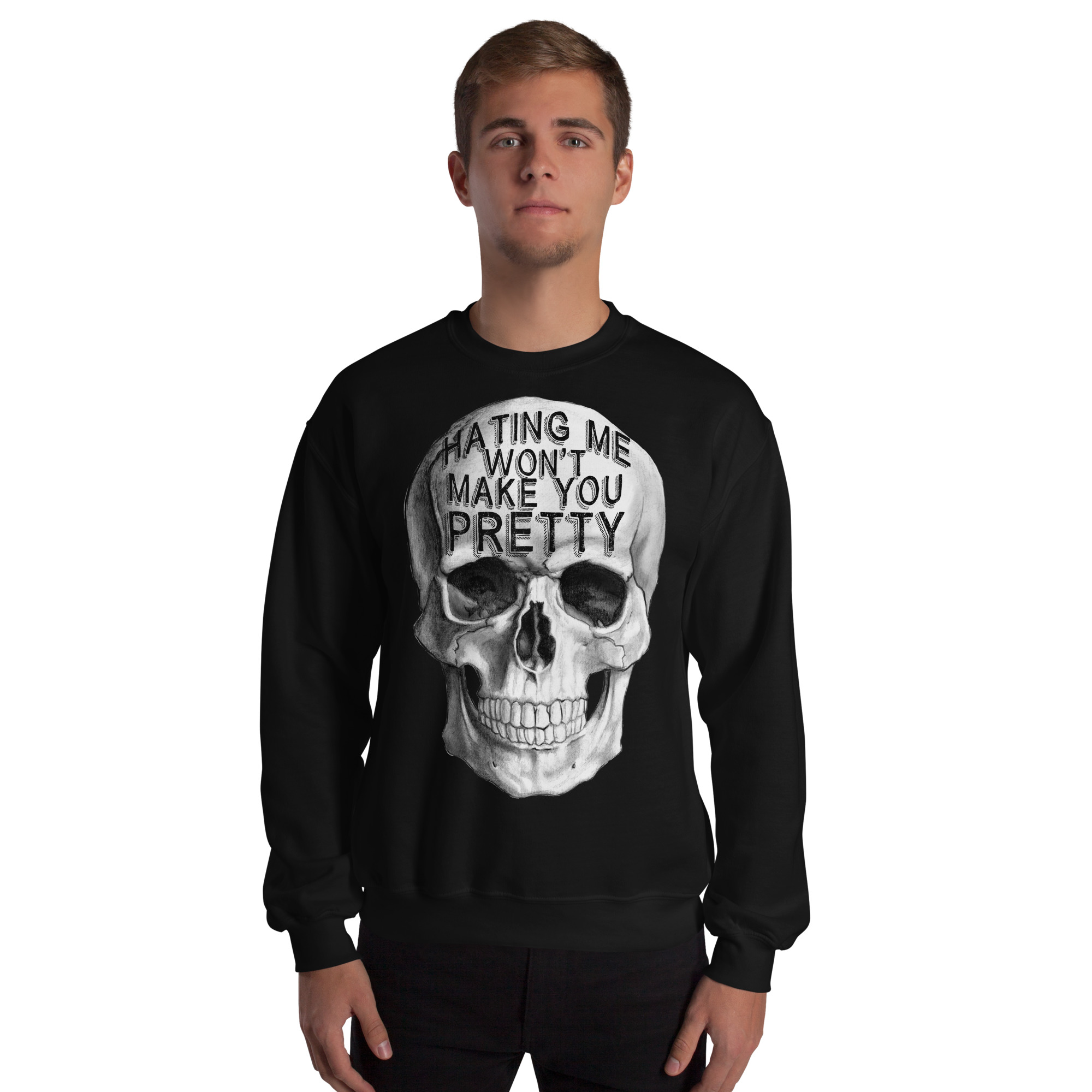 Sweatshirt tillverkad i blandad bomull/polyester med ett stort tryck på framsidan. Trycket är dekorerat med en stor dödskalle med texten ’Hating me won’t make you pretty’ i pannan. Unisex-modell som passar perfekt till både honom och henne.