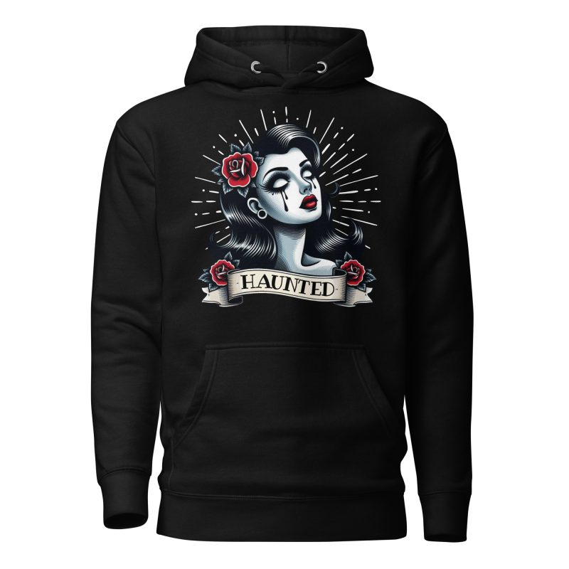 Hoodie i unisex-modell tillverkad i en extra fin kvalitet i blandad bomull och polyester. På framsidan återfinns ett stort tatueringsinspirerat tryck i old school-stil med texten ’Haunted’ som dekoration. Hoodien håller värmen riktigt bra och har ett otroligt mjukt tyg. Passar alla oss som älskar alternativa kläder.