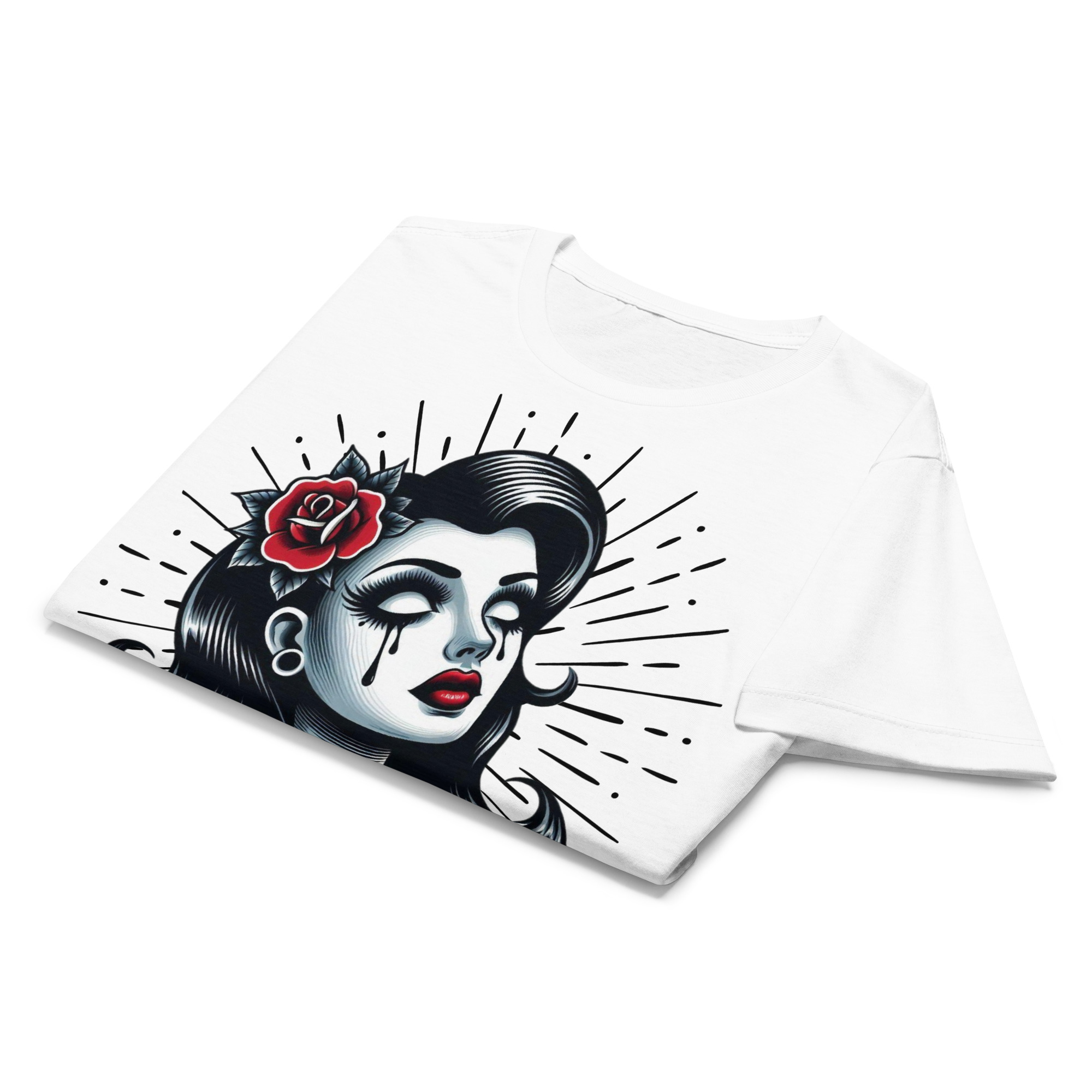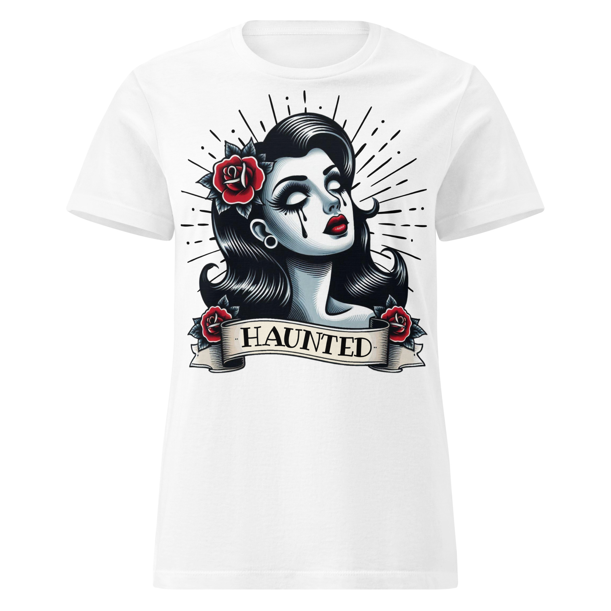Semi-fitted t-shirt i vitt med ett stort tatueringsinspirerat tryck i old school-stil med texten ’Haunted’ som dekoration på framsidan. Passar perfekt till kvinnor och är tillverkad i en supermjuk kvalitet i 100% bomull.