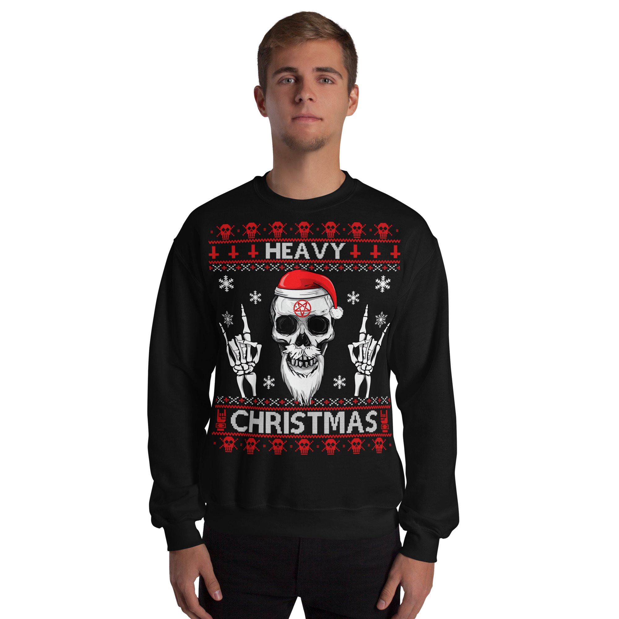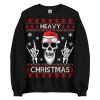Varm och skön jultröja i svart tillverkad i blandad bomull/polyester med ett stort alternativt julmotiv med en dödskalle med en tomteluva och texten ’Heavy christmas’ som dekoration på framsidan. Tröjan passar perfekt till både män och kvinnor som älskar udda jultröjor.