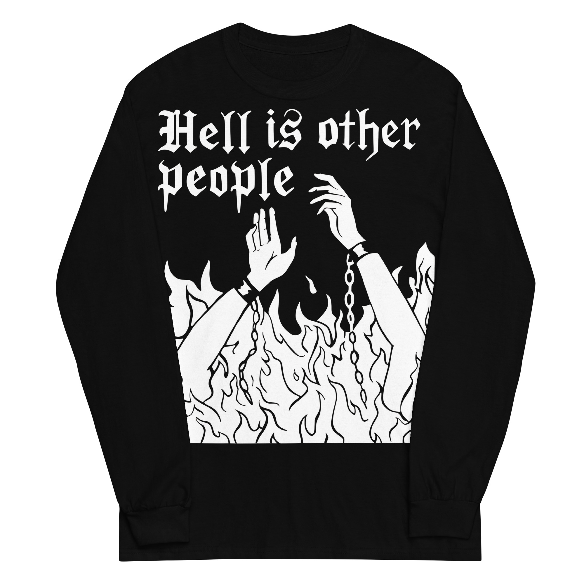 Långärmad tröja i en tunnare skön kvalitet med ett stort alternativt tryck med texten ’Hell is other people’ som dekoration på framsidan. Tillverkad i 100% bomull och passar alla män och kvinnor som älskar alternativa kläder.