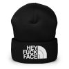 Mössa i svart med en välkänd omgjord logo med texten ’Hey fuck face’ broderat på framsidan. Tillverkad i ett stretchigt och allergivänligt material i turbo-akryl. Längden är 30 cm och den passar strålande till alla som älskar attityd.