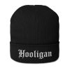 Ribbad mössa i svart med texten ’Hooligan’ i ett gotiskt typsnitt broderat på framsidan. Mössan är tillverkad i 100% organisk bomull som både andas och har en lätt vikt. Passar perfekt till både manliga och kvinnliga sinners.