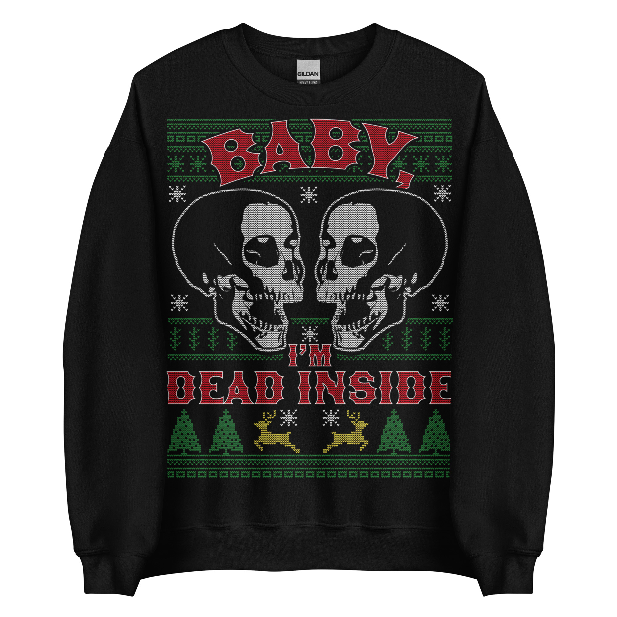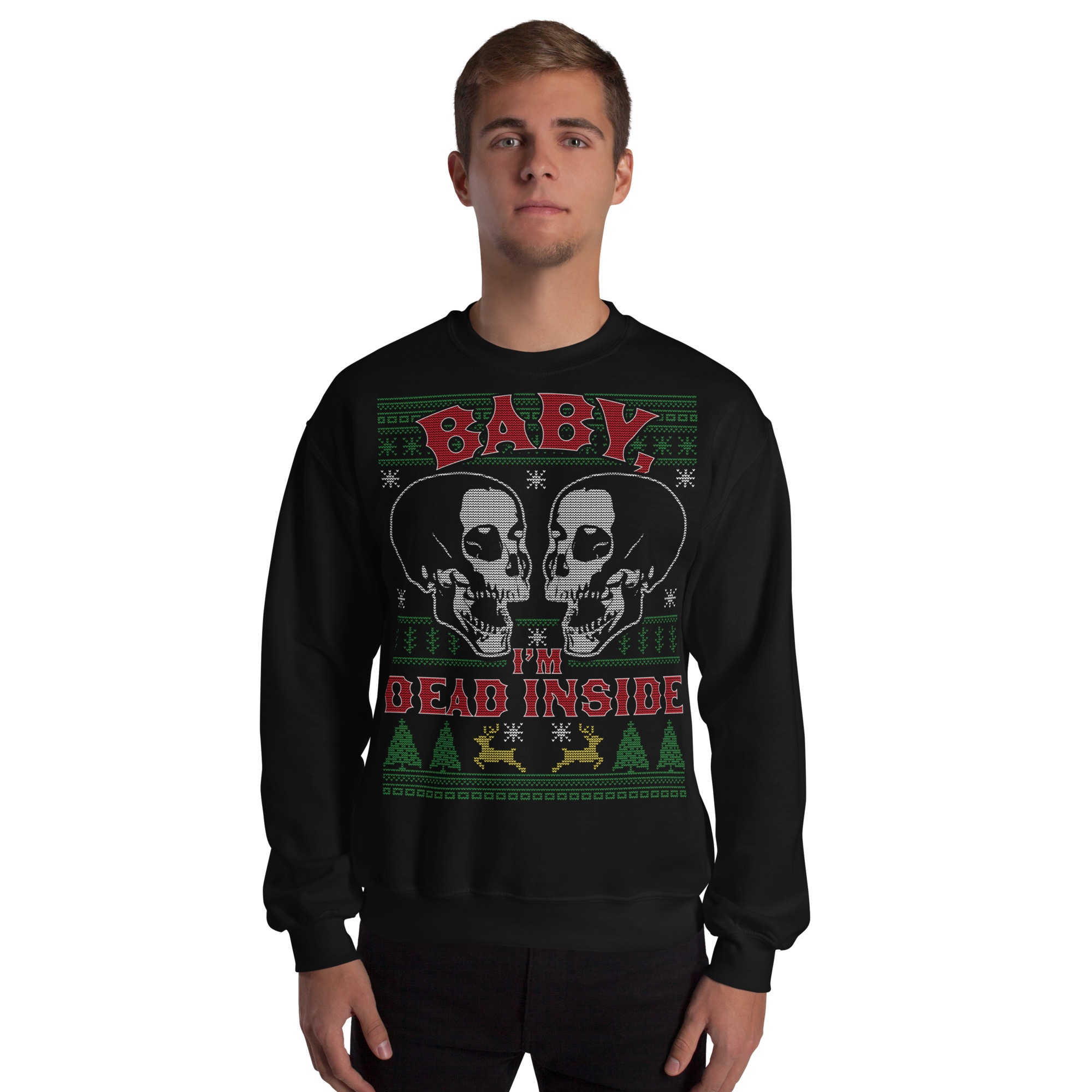 Varm och skön jultröja i svart tillverkad i blandad bomull/polyester med ett stort alternativt julmotiv med två dödskallar och texten ’Baby, I’m dead inside’ som dekoration på framsidan. Tröjan passar perfekt till både män och kvinnor som älskar udda jultröjor.