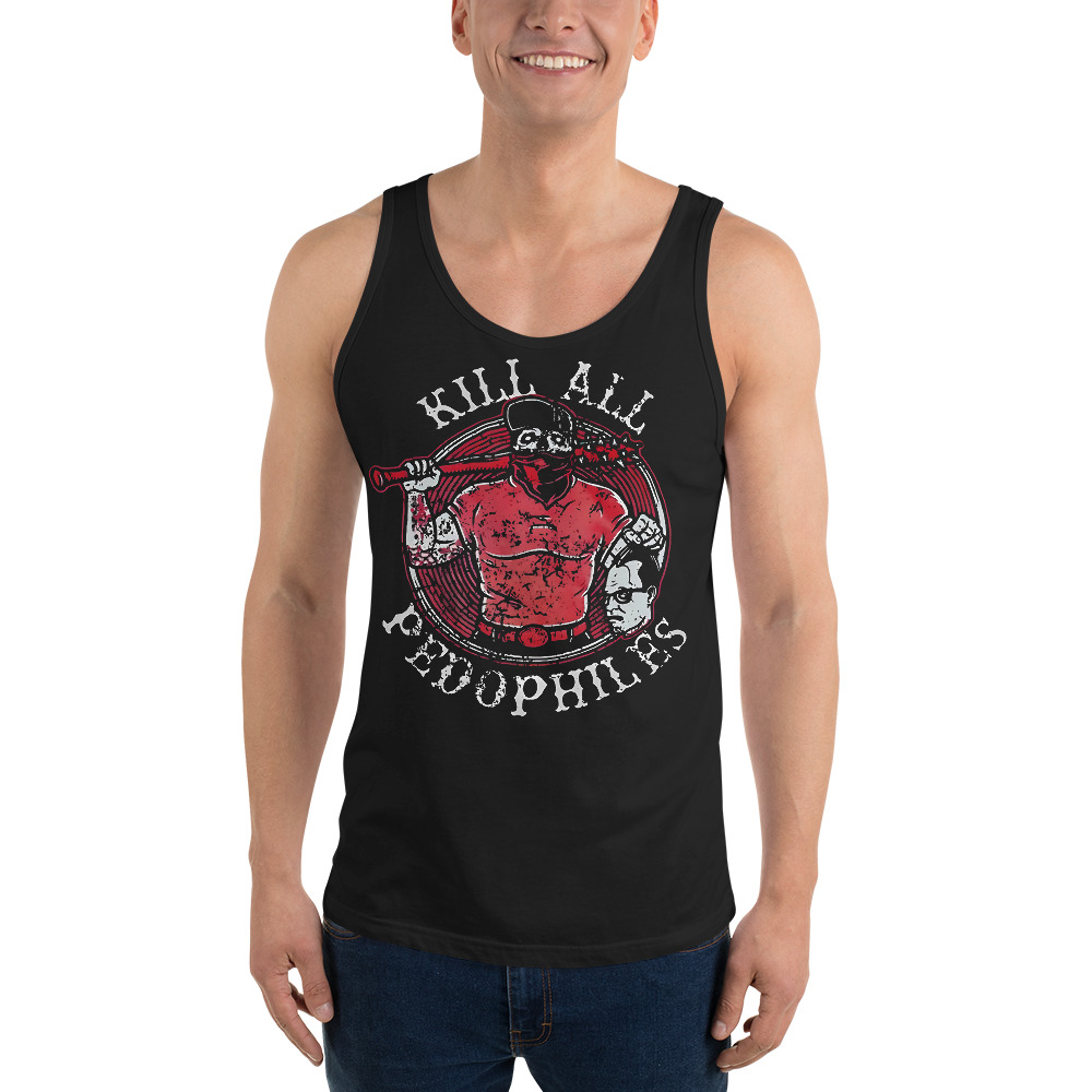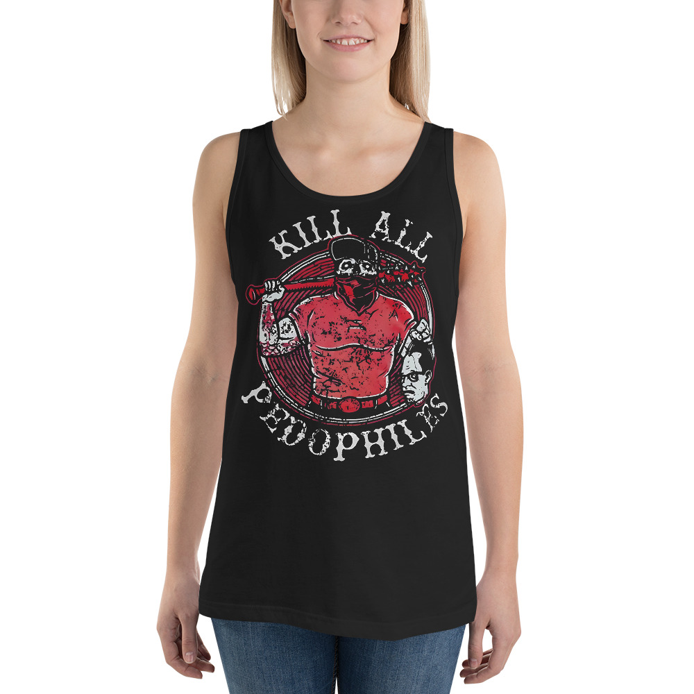 Linne i svart med ett stort tryck med en man som håller i ett avhugget huvud och texten ’Kill all pedophiles’ som tryck på framsidan. Tillverkad i en skön kvalitet i 100% bomull. Passar perfekt till både män och kvinnor som älskar den alternativa stilen.