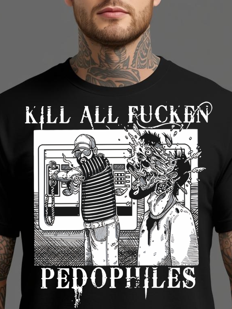 T-shirt i svart med ett stort detaljrikt tryck med texten ’Kill all fucken pedophiles’ som dekoration på framsidan. Passar perfekt till kvinnor och män som älskar den alternativa klädstilen. Tröjan är tillverkad i en supermjuk kvalitet i 100% bomull.