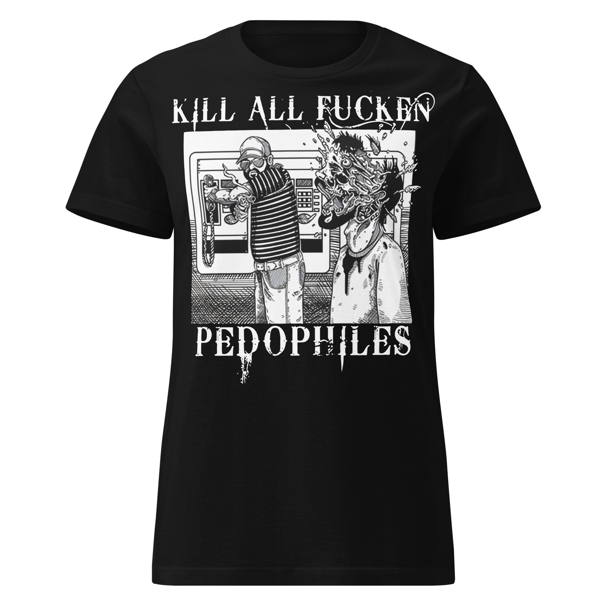 Semi-fitted t-shirt i svart med ett stort detaljrikt tryck med texten ’Kill all fucken pedophiles’ som dekoration på framsidan. Passar perfekt till kvinnor som älskar den alternativa klädstilen. Tröjan är tillverkad i en supermjuk kvalitet i 100% bomull.