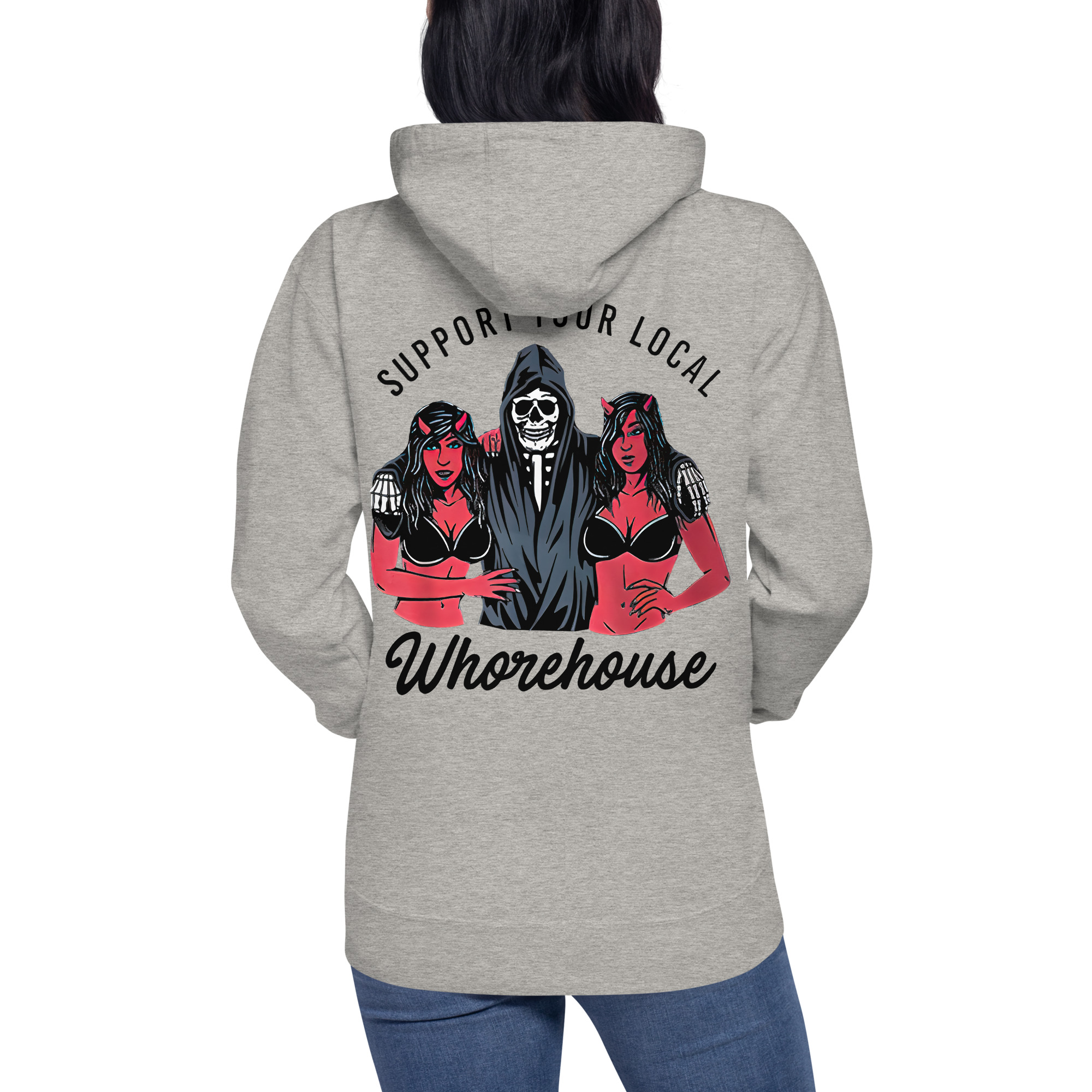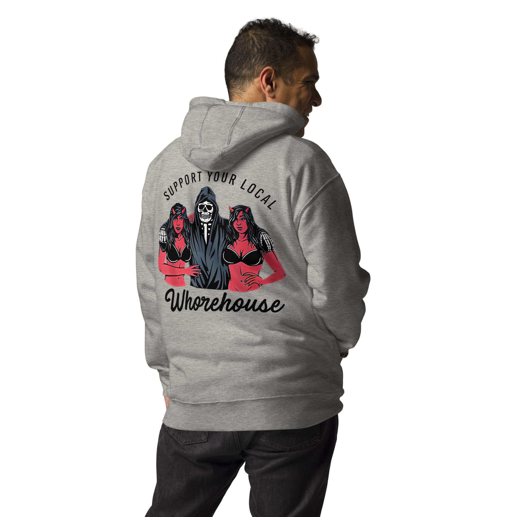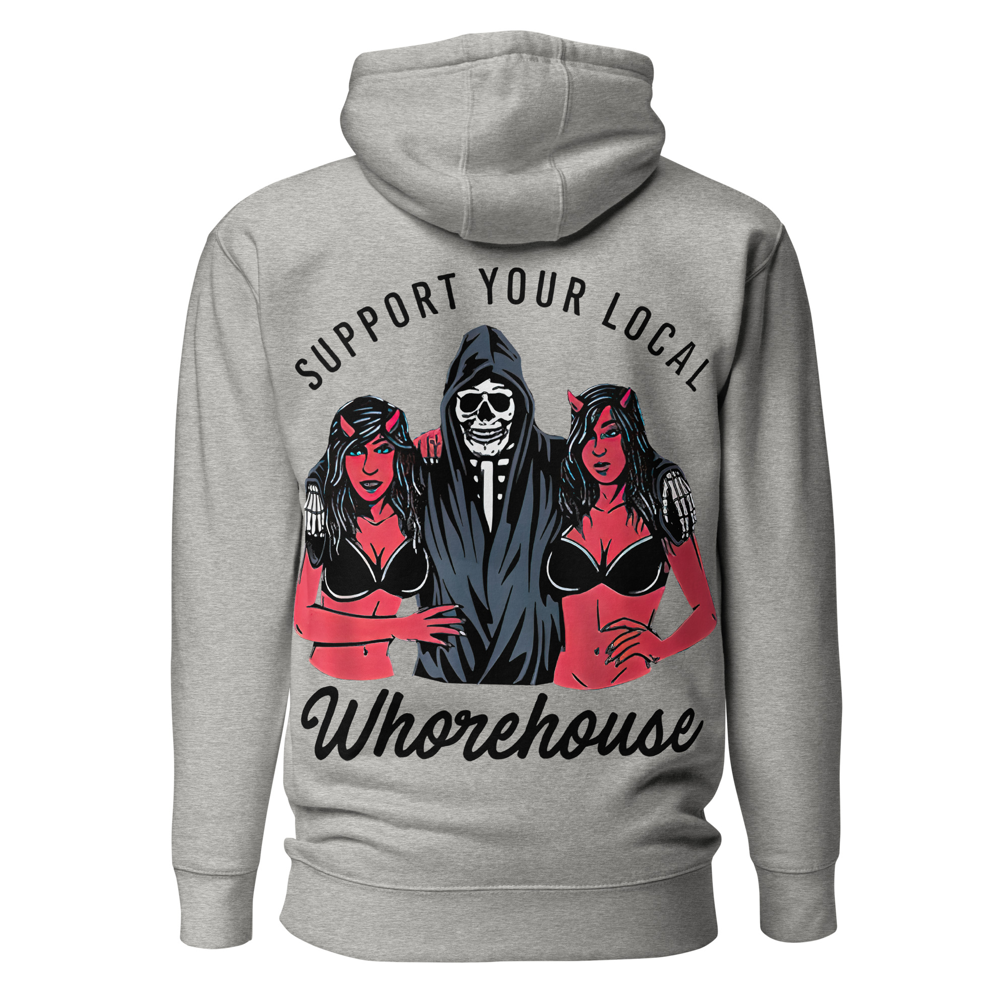 Svart hoodie i unisex-modell tillverkad i en extra fin kvalitet i blandad bomull och polyester. Baksidan är dekorerad med liemannen med sina två kvinnor och texten ’Support your local whorehouse’. Hoodien håller värmen riktigt bra och har ett otroligt mjukt tyg.