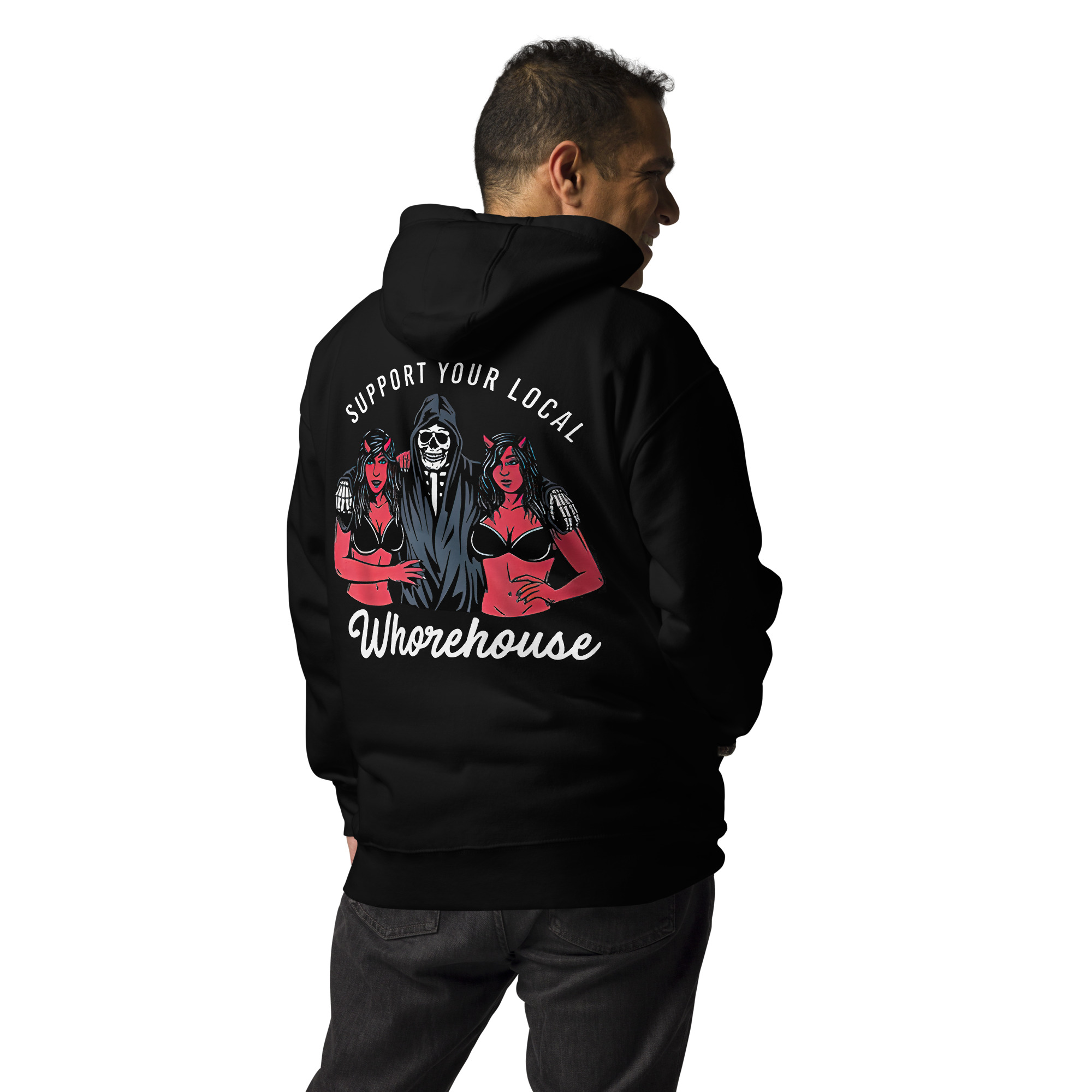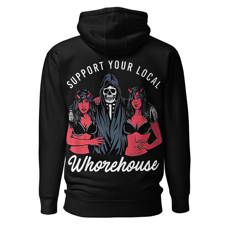 Svart hoodie i unisex-modell tillverkad i en extra fin kvalitet i blandad bomull och polyester. Baksidan är dekorerad med ett detaljrikt tryck med texten ’Support your local whorehouse’. Hoodien håller värmen riktigt bra och har ett otroligt mjukt tyg.