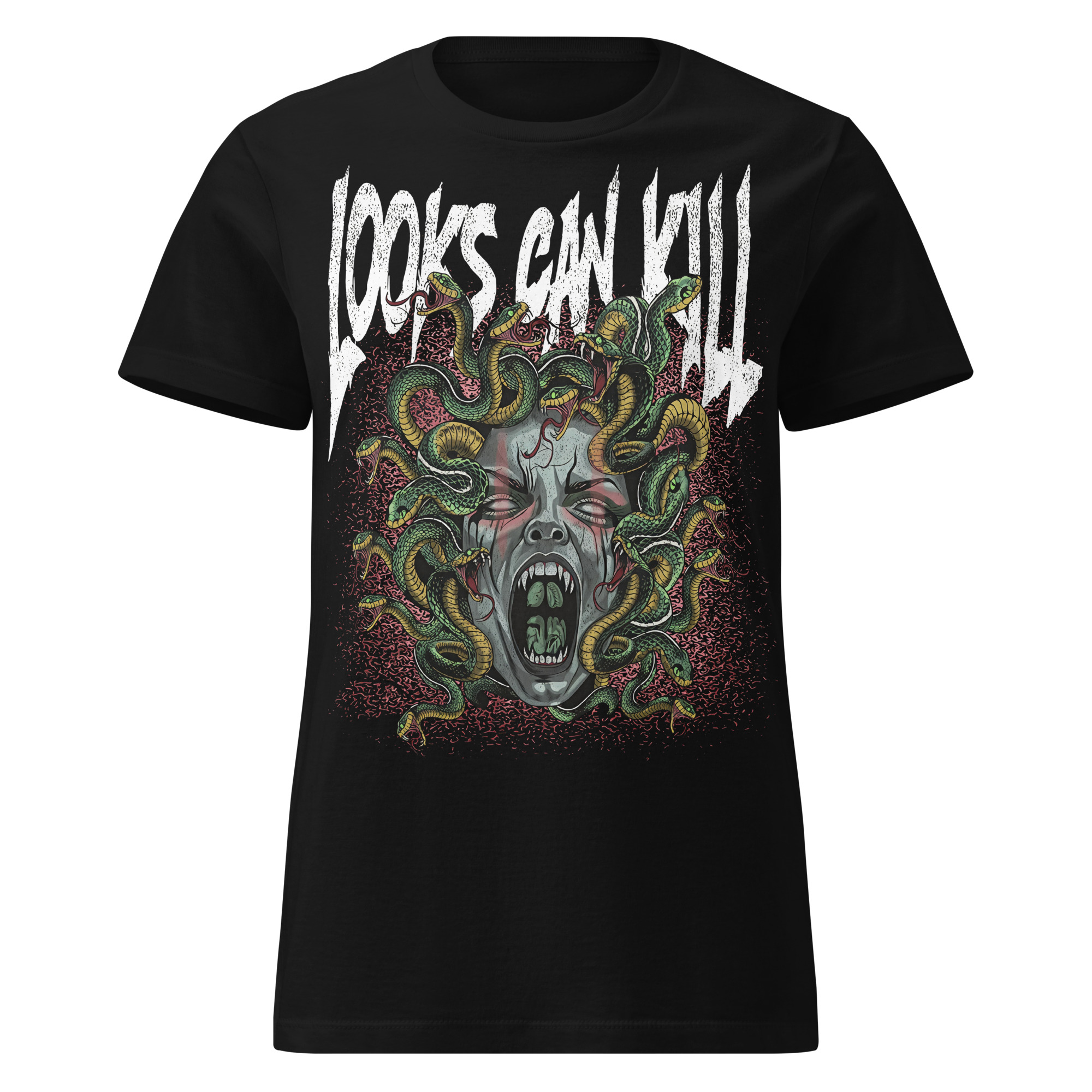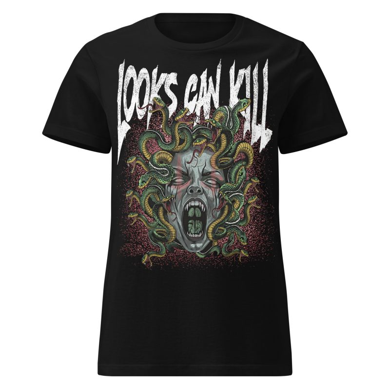 Semi-fitted t-shirt i svart med ett stort alternativt tryck med Medusa och texten ’Looks can kill’ som dekoration på framsidan. Passar perfekt till kvinnor som älskar alternativa kläder. Tröjan är tillverkad i en supermjuk kvalitet i 100% bomull.
