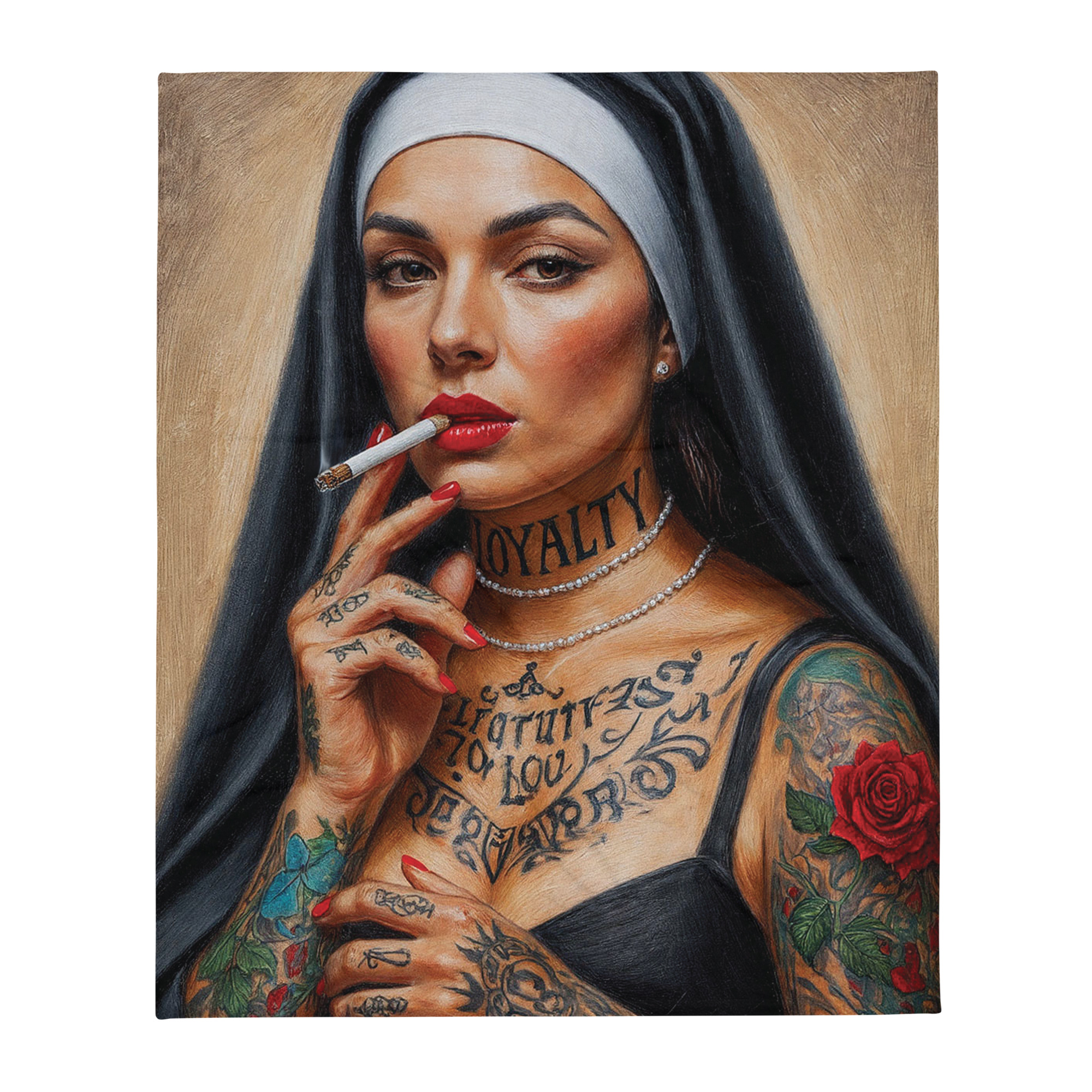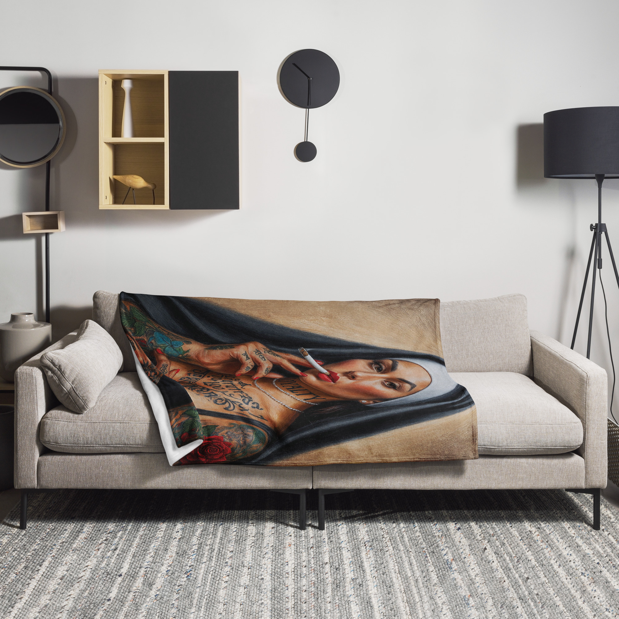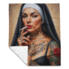 Snygg pläd med en tatuerad nunna som röker en cigarett som dekoration på ena sidan. Materialet är 100% polyester i en otroligt mjuk och fin kvalitet. Pläden är både allergivänlig och tillverkad i ett brandsäkert material. Storleken är 127×153 cm. Baksidan är lika mjuk och skön som framsidan i en vit färg.