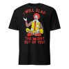 T-shirt i svart med ett stort tryck med en välkänd clown från en snabbmatskedja och texten ’I will slap the McShit out of you!’ som dekoration på framsidan. Passar perfekt till kvinnor och män som älskar attityd. Tröjan är tillverkad i en supermjuk kvalitet i 100% bomull.